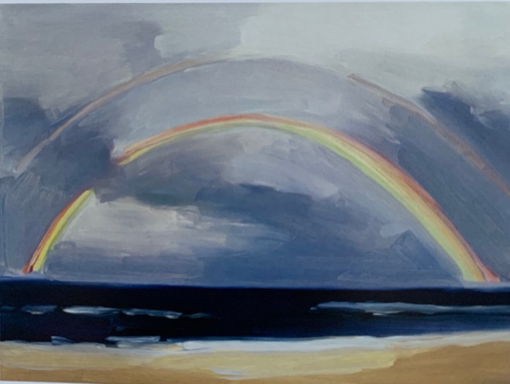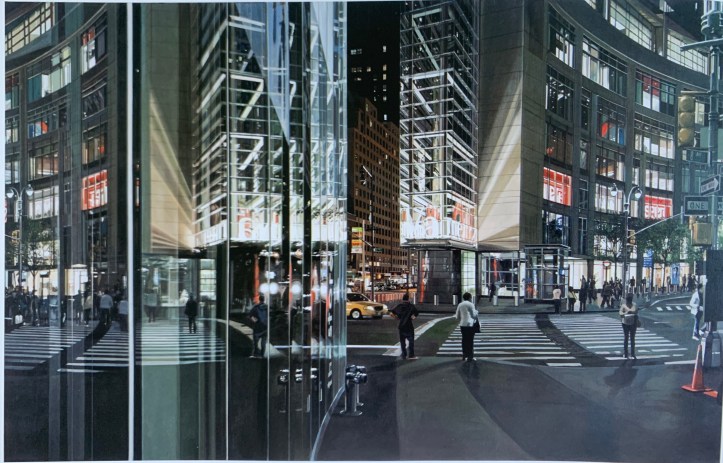 Below I put my selection of artworks from this chapter to illustrate how stretchy and versatile the realism as a genre can be: from left to right “Eminence Break” by Damian Loeb 2012; oil on linen; “Columbus Circle at Night” by Richard Estes, 2010, oil on canvas; “Mountain, New Moon” by John Beerman, 2014, oil on linen; “Summer rainbow, Cape Cod ” by Maureen Gallace, 2006, oil on panel;