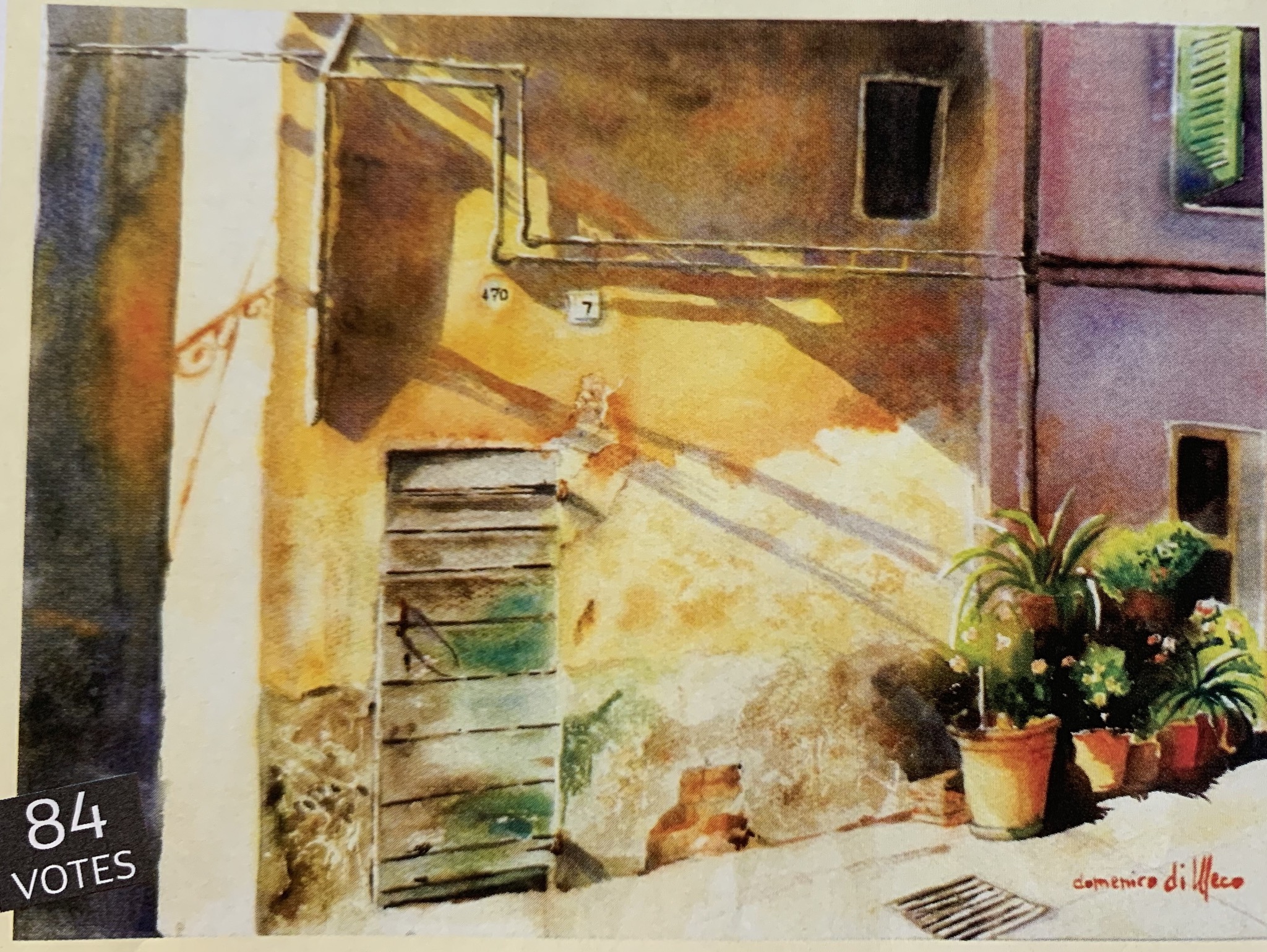 These 2 images are from the magazine, #45 “L’art de L`Aquarelle”. What I noticed and really liked about these paintings is the sunlight which was brought by the artists carefully depicting shades and different tones of objects. That helped me to come with my own ideas what to paint for this exercise and you will see it below: there is a study of sunlight coming upon people and trees.