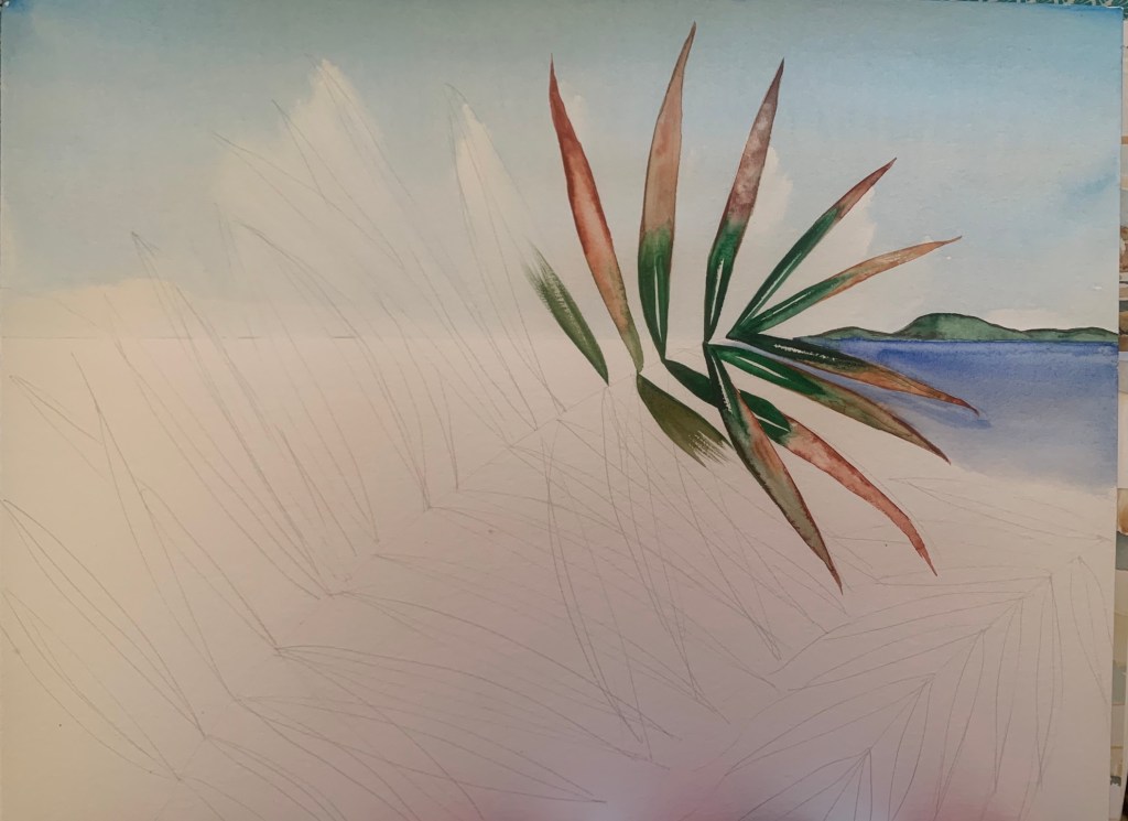 I did it with Sennelier aquarelle set. My idea was to bring viewer’ attention to the beauty of the leave which is partially dry, not perfect but still amazing. I placed it to the front part of this landscape painting, close to viewer’s eyes.