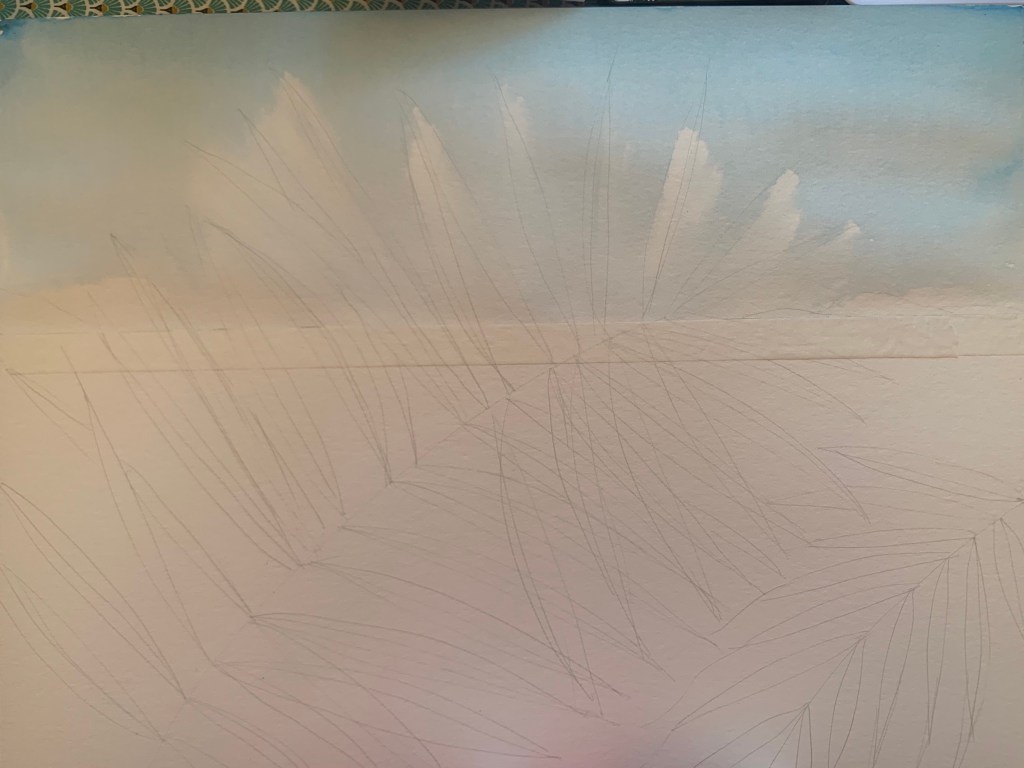 Firstly I sketched the parts of the sky and the sea, also I placed the pond with a pathway near it. Then I did the washes for the sky and the sea. After that I sketched the stems of 2 trees with the black colour. The ,most time consuming part was to create the green mass in the aping because it contained lot of details: some leaves were in the shadows and sone – under the sun light. All the greens contain several layers of different pigments: i started with different shades of green and added lot of black, white and yellow on top in places where I needed to create shadows and light.