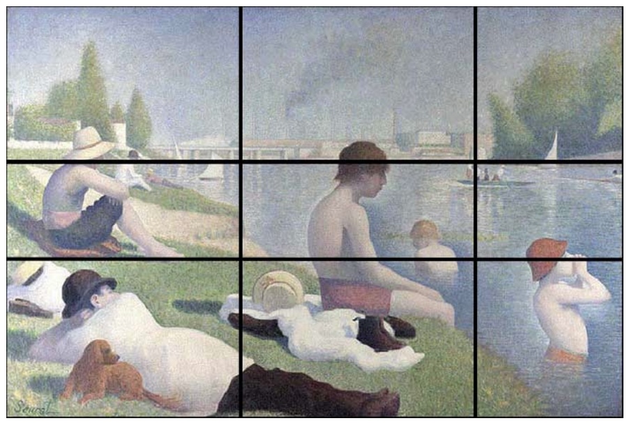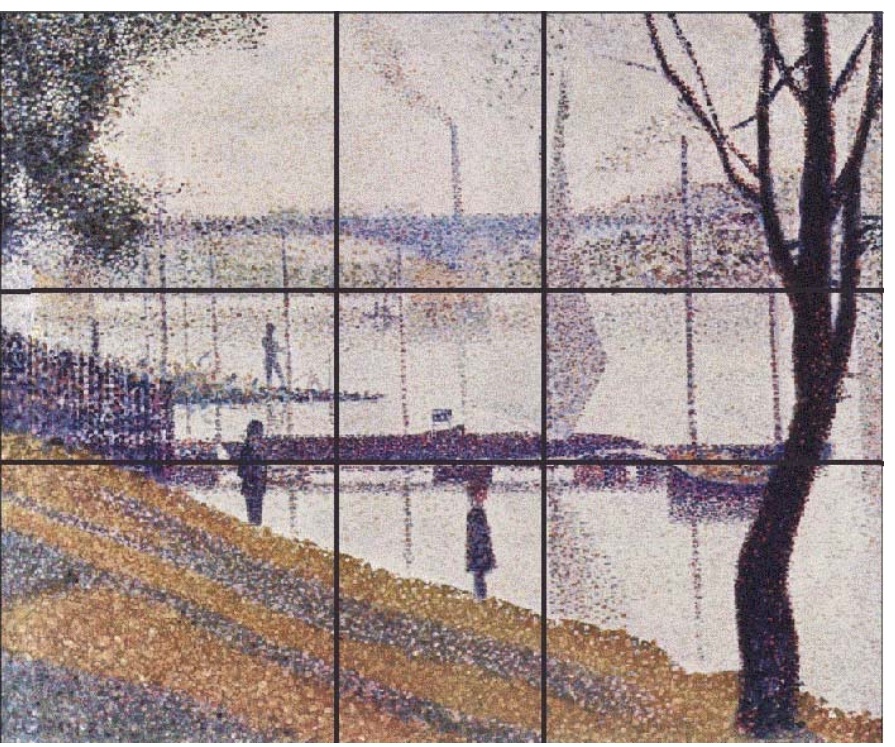 Another option is to segment the painting into nine unequal section using the golden ratio of the columns as 1:0,618:1, the same for the rows.