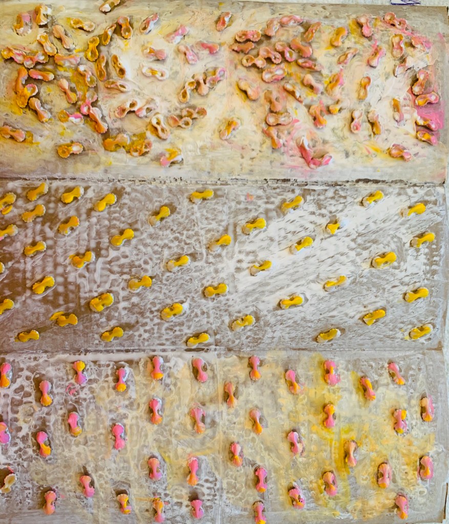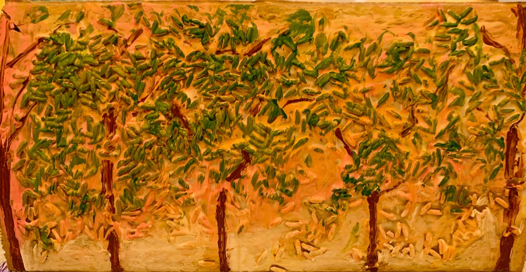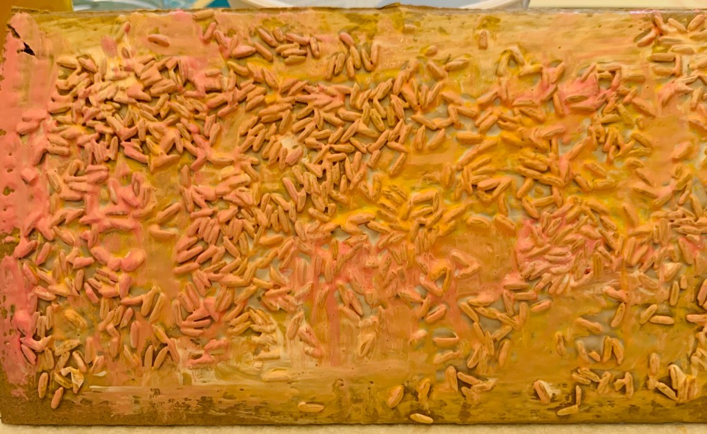Below is the texture surface I have made using basmati rice. I had put the rice on a layer of PVA glue and painted it with pink and yellow acrylic paints. I made myself very loose and just let go with a flow, waiting for the idea to come without urging myself. At some point I understood that the rice looks like tree leaves. So I added some tree stems with brown colour and painted green some areas.