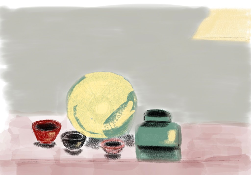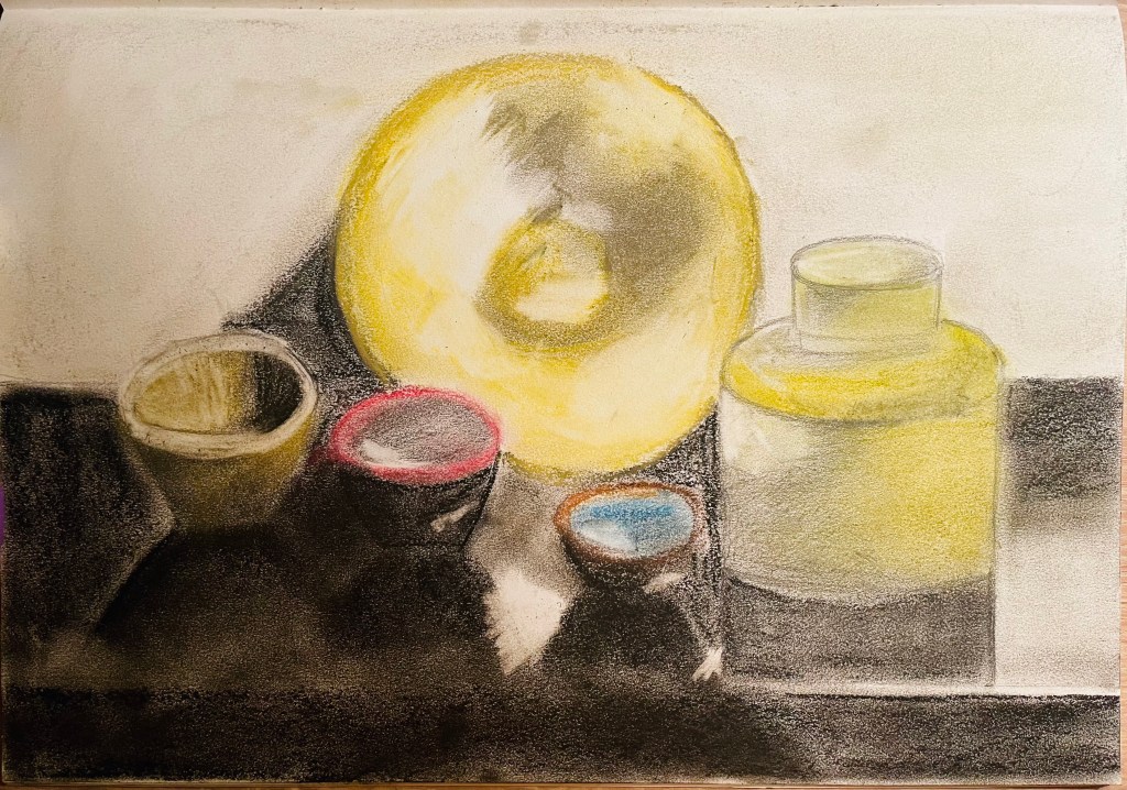 After I did my studies of my different compositions, I saw that I got very engaged with #1,#2 – both on black lacquered console, and #5 – which is one out of my four bustling and super interesting “after breakfasts” landscapes of plates and cutlery. Also, I enjoyed working with dry pastels – #1. Actually, at first, I did another composition with oil pastels with water on top. But, with dry pastels, it came out much better, more expressive and balanced. The negative space, such as the smooth light grey background wall behind the objects, came out even and played nicely with rich black shadows and sparkles of reflected light on the black console. It seems this study has more depth and volume. Study #2, which is, in reality, was done earlier, came out as very different because of the negative space – the background wall appeared as very busy with stripes and lines. However, I liked the shadows from the white porcelain teapot, a milk saucer and olive coloured vase. The reflected shadows from the objects on #2 on the console appeared delicate. But this study looks a bit flat.