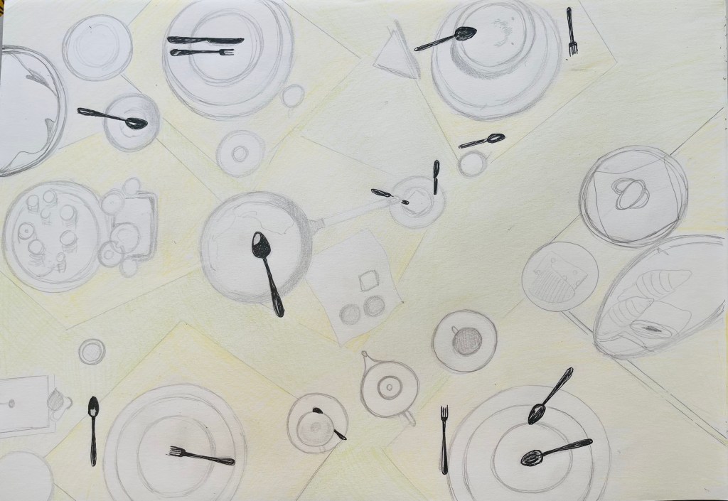 Exercise 1.1. In this exercise we have to heighten our observational skills and study our compositions rigorously in terms of everything we can observe: negative space, spatial relationships between the objects and the edges of the paper; we have to make a series of quick sketches observational studies of sections and details of the table. It is recommended to mix the drawing and painting media, to use the whole area go the paper. ‘The exercise is designed to develop your familiarity with and understanding of of the material qualities and spatial relationships that exist on the table.” (OCA, Painting Two course book, page 36);