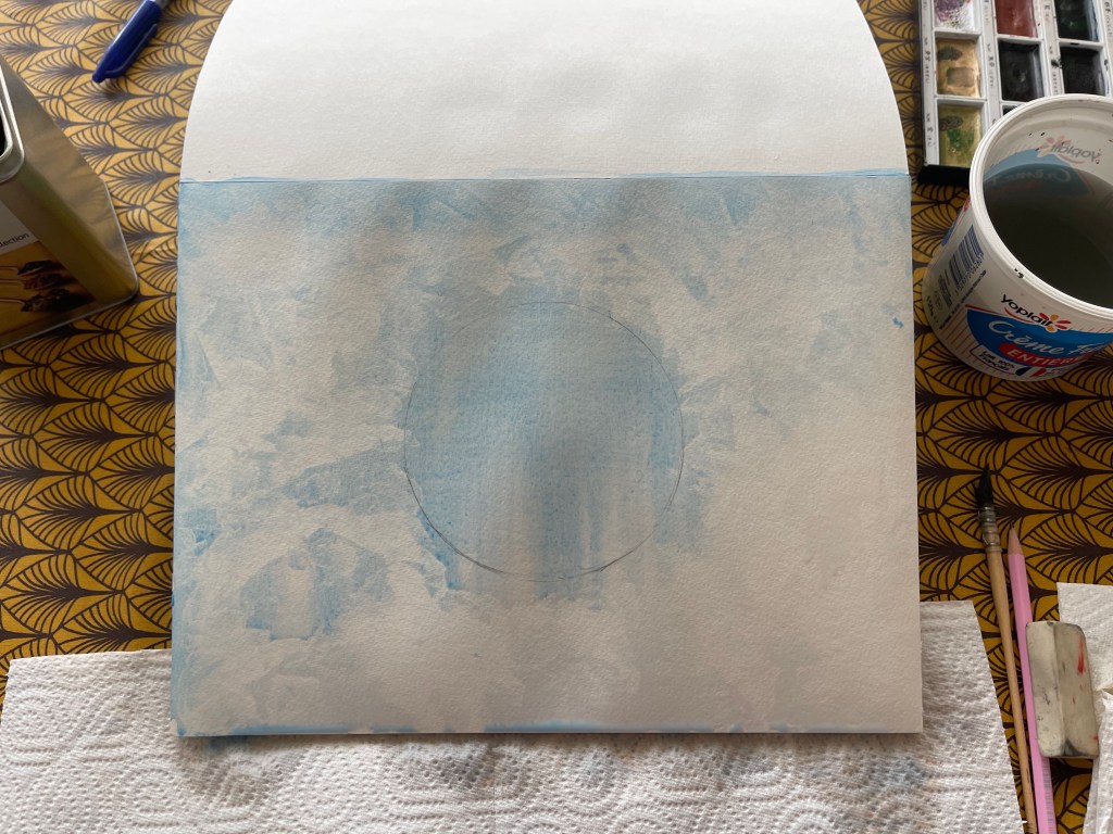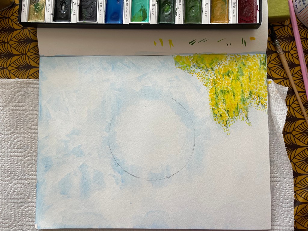 This reflection in the pond is a very complex stage. Aquarelle is the best medium for this exercise. I did my study in a rectangular shape as it is with the pond and made another one, making the reflection in a round shape. Below is my work in progress. My perception of “incision in the space” was like seeing another reality through a window. Like there is another whole world and dimension, a door to enter to get into another world you can see from this Earthy plane, provoking a feeling of estrangement. Working with reflections made me work in the landscape genre, developing a constructed reality, abstracted topographies and complicated vistas. As Barry Schwabsky says in his book “Landscape Painting Now”, 2019, p. 311: ” A vista … is a view, but not just any view: it is a view out to a far prospect …. succession of planes or objects.”