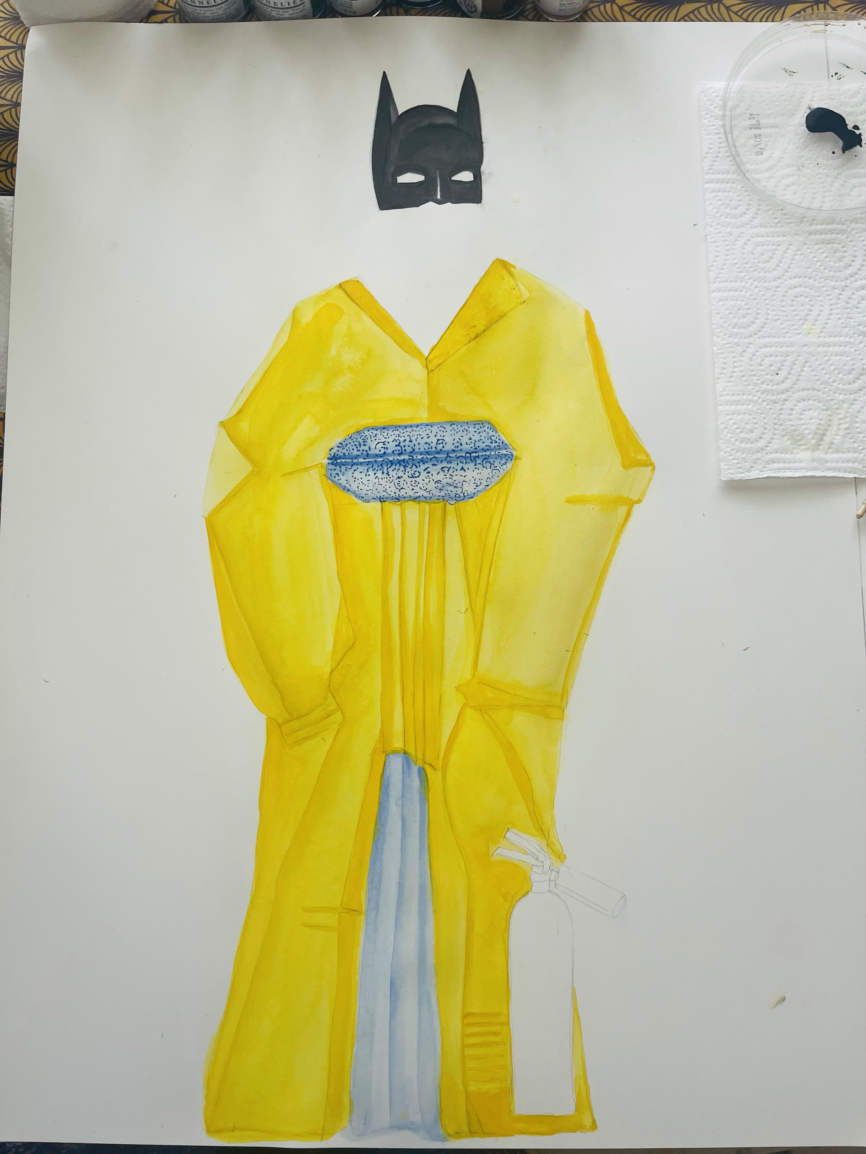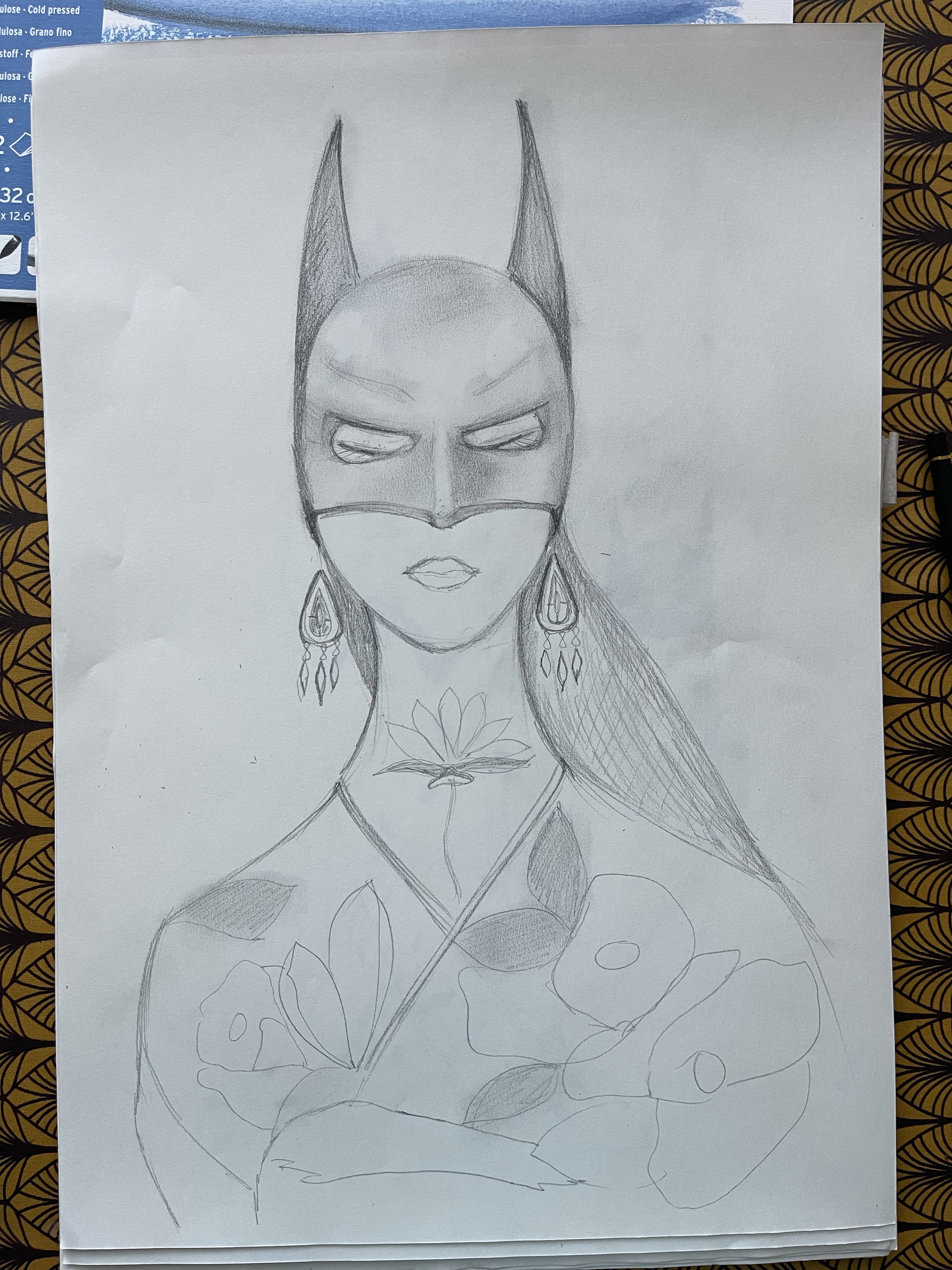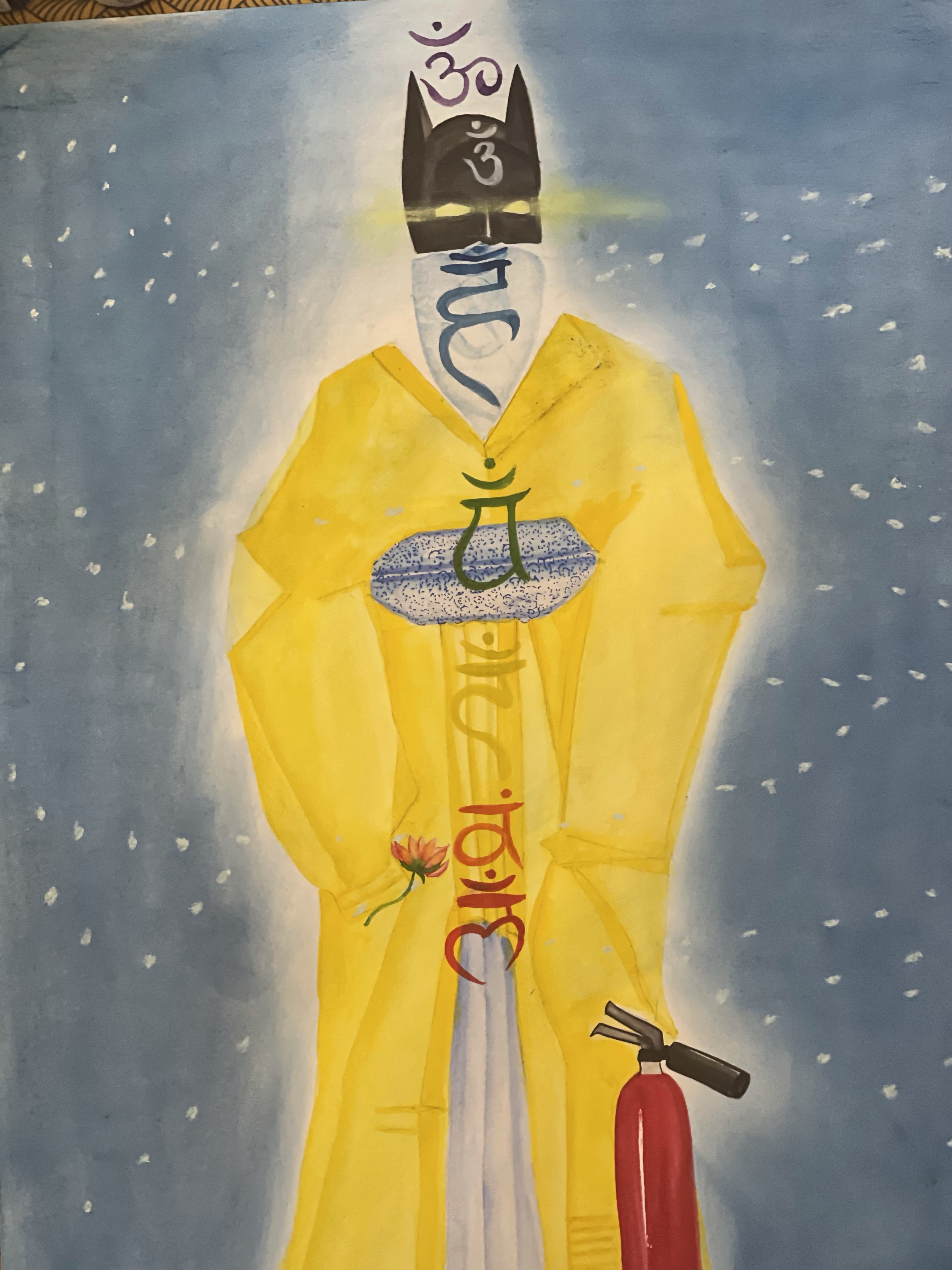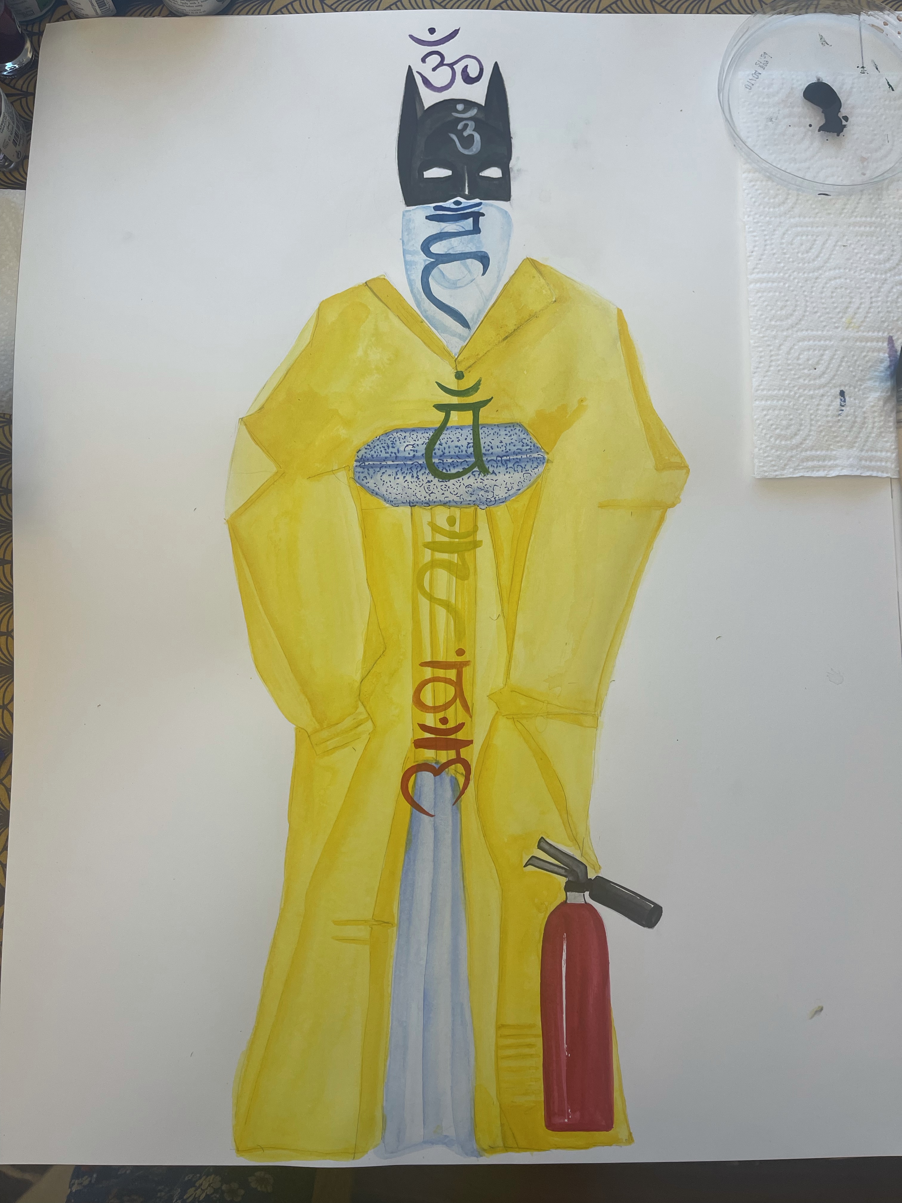 It does require some knowledge about the Theory of Reincarnation and Hinduism, which are my project’s main contextual focus points. I like the outcome also because even if someone is not familiar with the details of the concept of Karma, chakras, etc., the image is still quite engaging. It is interesting to look at it. Most viewers get curious and try to understand the idea behind it. Even from the visual point of view, it appears as something not banal. Batman’s mask is familiar and intriguing at the same time. I am not humble here. I see a lot of potential for developing this idea further. I can do it as a triptych. I also can change the look of the kimono and make a female story. There are plenty of opportunities to play with it, think, and add more details.