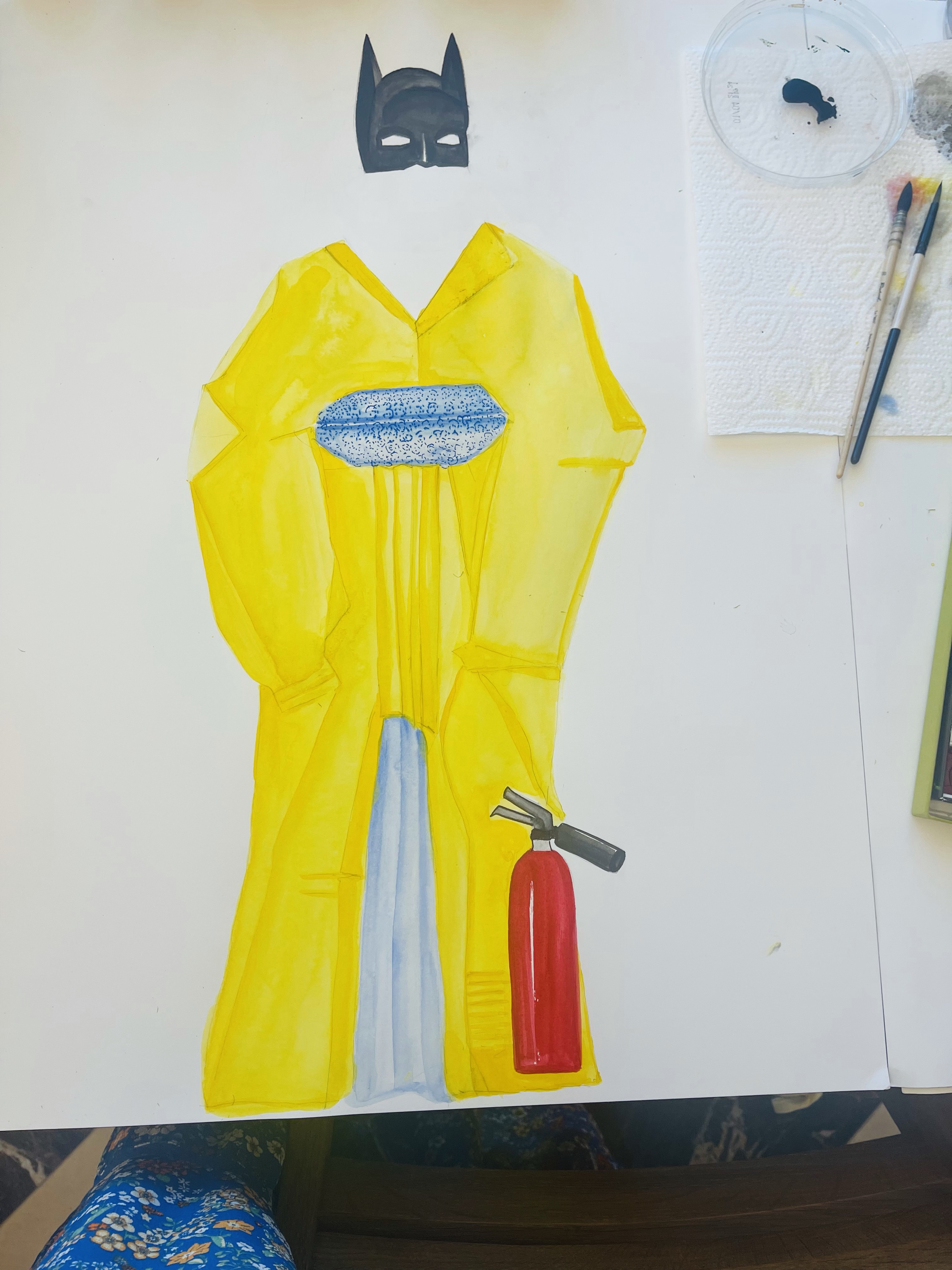 When I assembled my yellow paper kimono piece, I had no idea that I would develop it into an art project. However, the kimono started to live its own life straight from the beginning as soon as I stuck it to the wall. Now I understand that the piece began to “pick up” a contextual focus immediately, straight away. Batman’s black plastic mask’s installation idea quickly came naturally because the kimono was “asking” for a “head” to complete the image. Without the top, it was powerful but incomplete. The paper kimono directed me into a concept of “mission”, the mission of samurai, the mission of dutiful engagement in the battle. Batman’s mask revealed my constant inner tension and feeling of unavoidable fighting we have to endure while living our lives. Life on Earth is a sort of “mission impossible”. Any soul’s journey is to learn stoicism in hardship and courage, differentiate the Good from Evil, learn how to resist Evil, and fight it back. The same is related to the philosophy of samurai. That is why I think this mask and the kimono are in harmony. The image of the warrior shows the problematic existential crisis, which is always a part of living for every human. The fire extinguisher signifies the emotion of being often quite helpless in Life. Even if you don’t have any means to deal with the situation, you always have to deal with it somehow. I deliberately picked up a fire extinguisher instead of a sword or gun because it shows the conflict: we have to fight though we are not always are born warriors; we have to be ones. Maybe a plastic toy sword could signify our helplessness as well. That was my thinking at implementing exercise 1.
