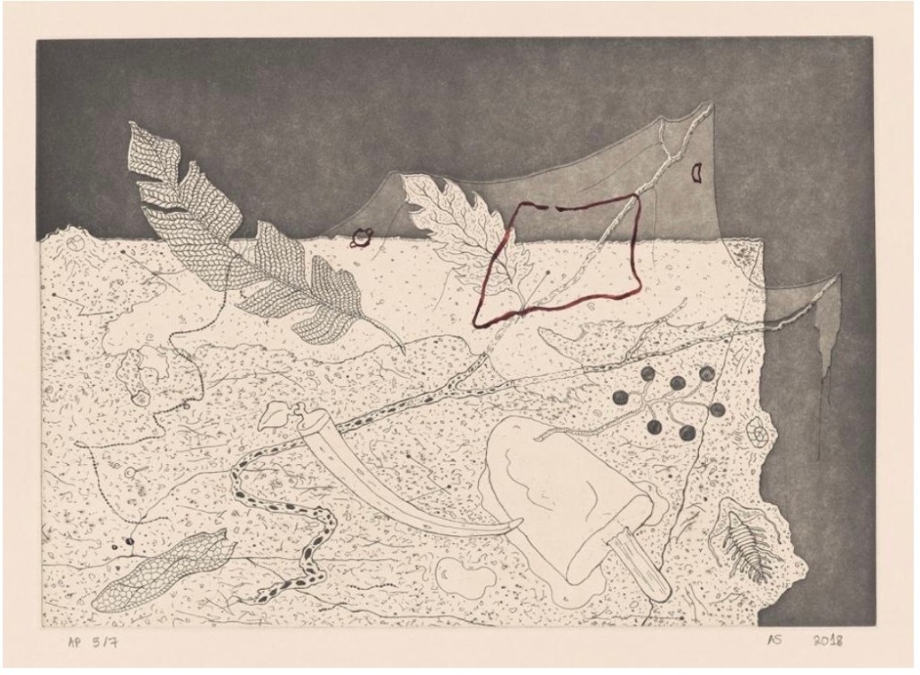 S.O.S., 2016-2017, Anj Smith, oil on linen, image via http://www.wallpaper.com; “Night Haul”, 2017-2018, copper etching with aquatint on Somerset paper, with watercolour, pencil, ink; photography Alex Delfanne, image via http://www.wallpaper.com; False Steward, Anj Smith, 2019-2020, oil on linen, photo: Alex Delfanne, image via http://www.thenewartgallerywalsall.org.uk