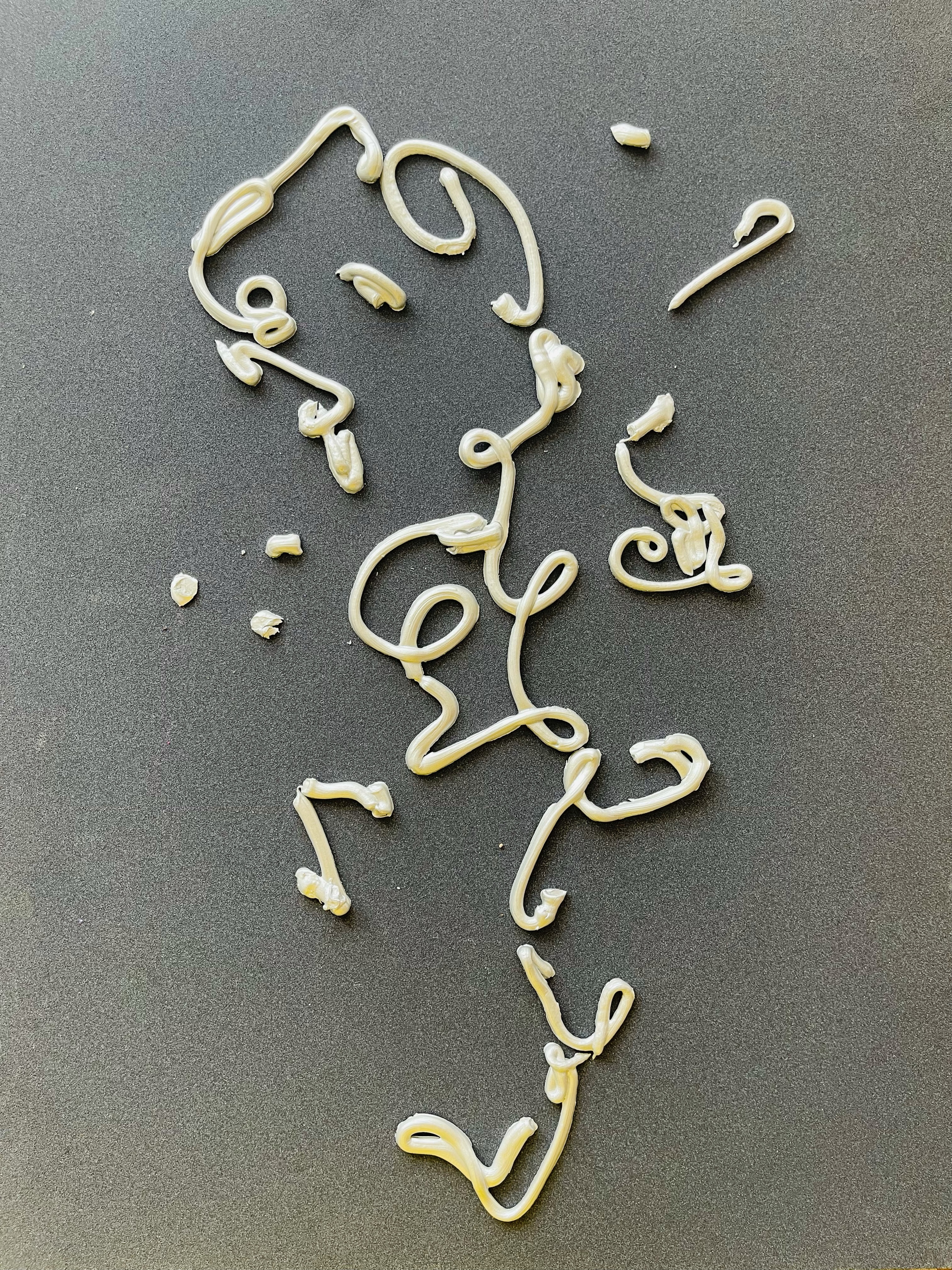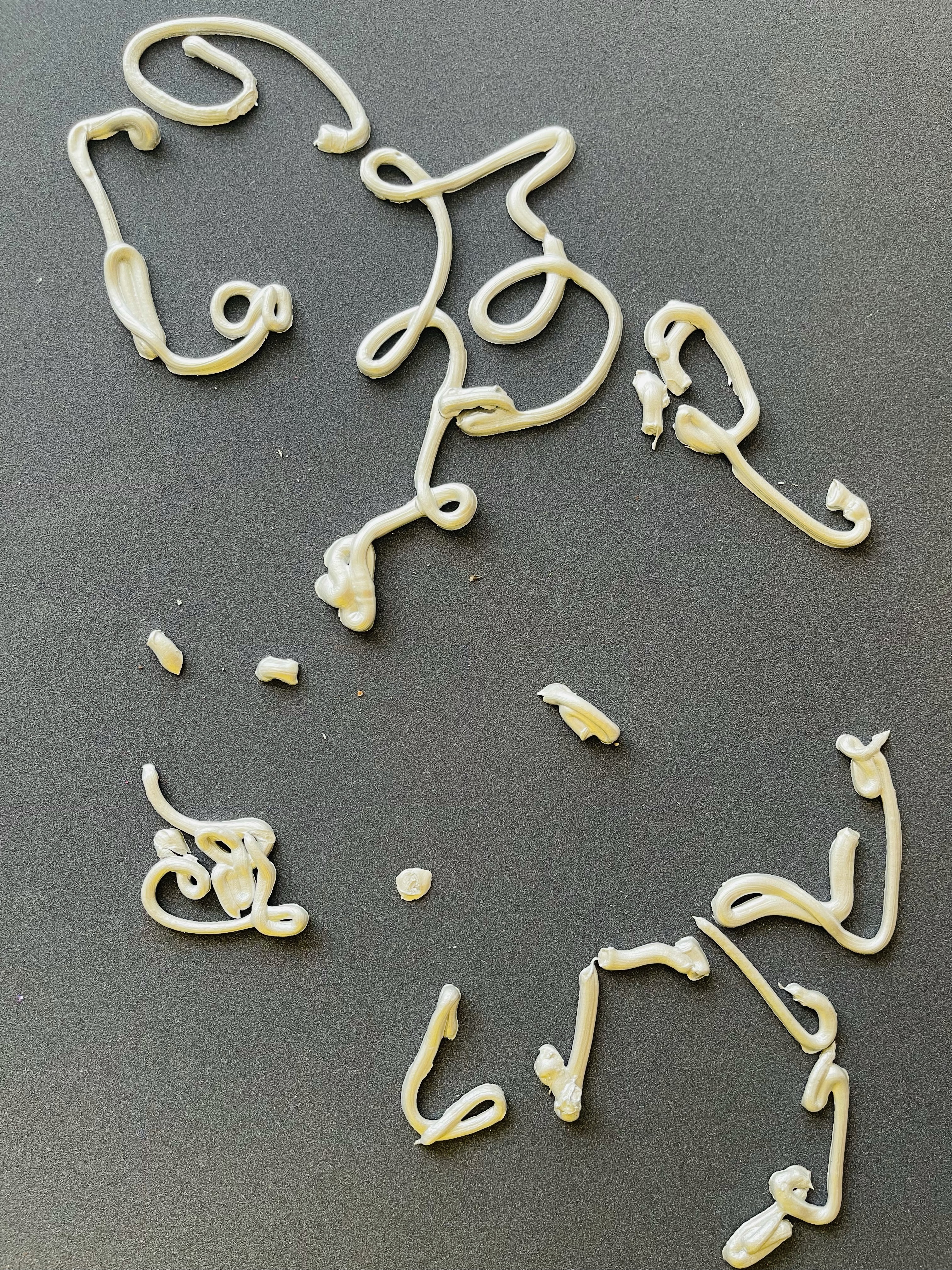 After I peeled of the dry sculptural pieces of paint, I started to arrange them. I played with silver pieces on grey coarse paper for dry pastels. The dry pieces of silver acrylic paint reminded me some sort of calligraphy and hand writing.
