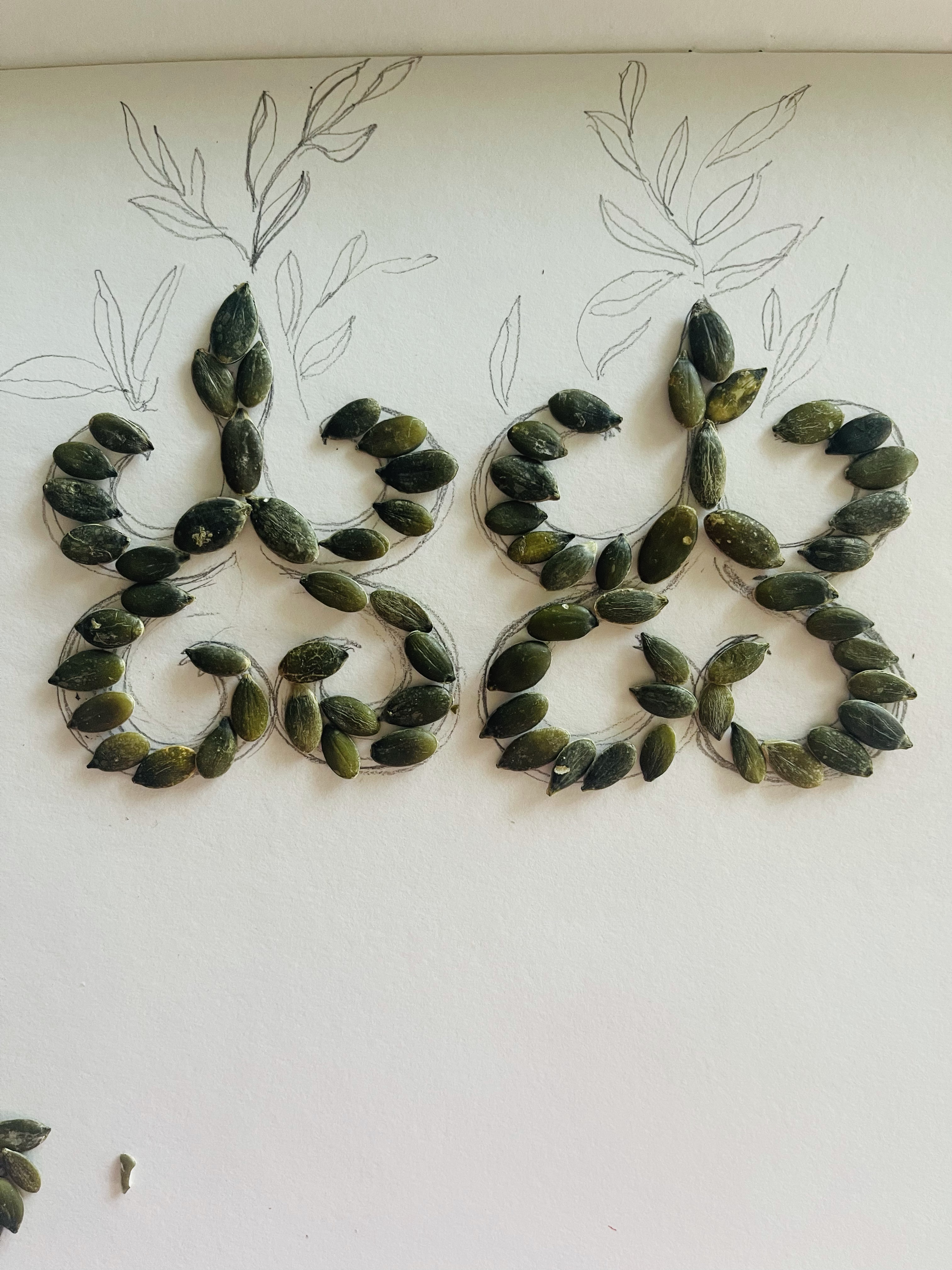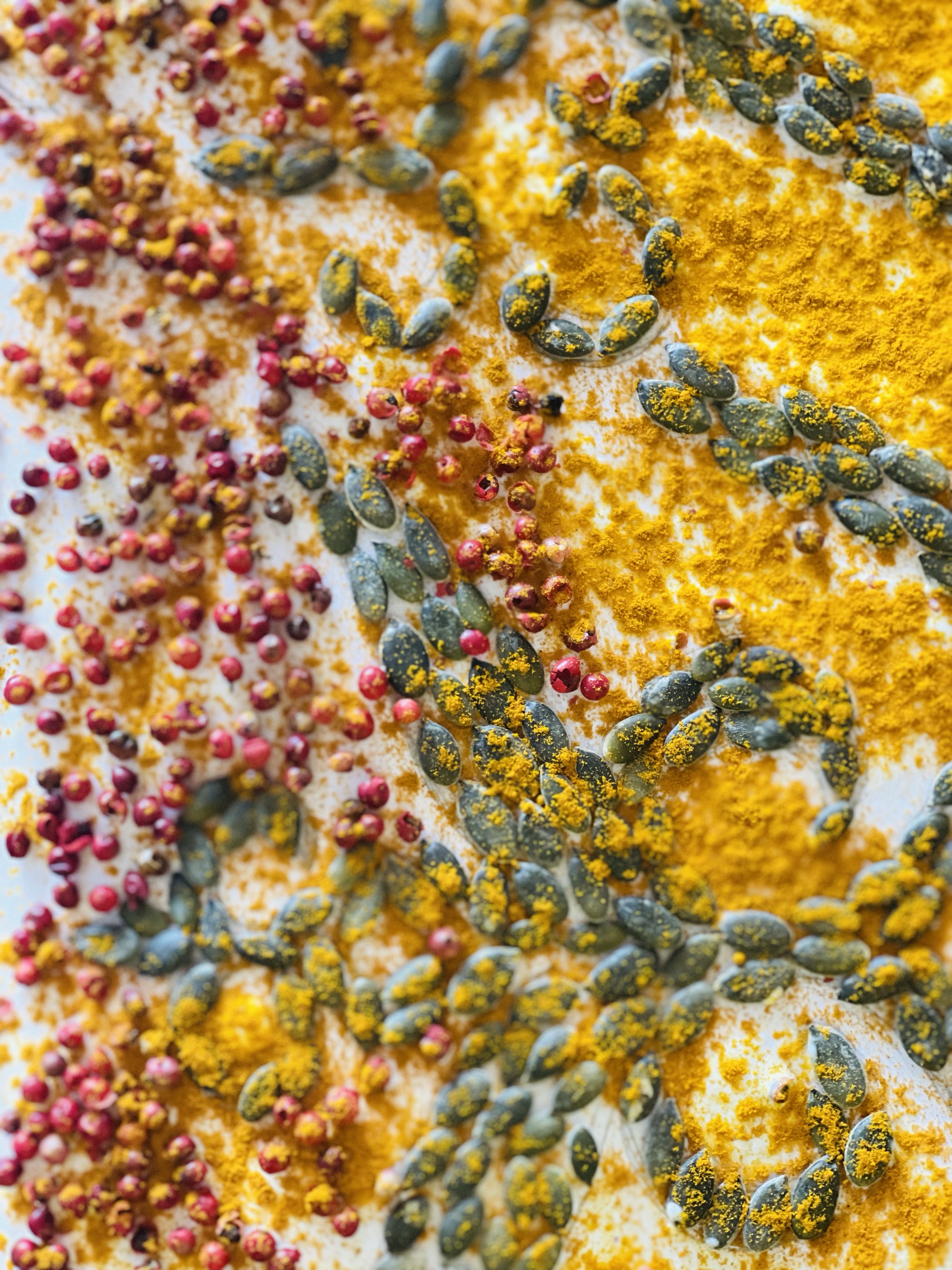 Here is the list of materials I want to use and explore: pumpkin seeds, pink peppercorns, turmeric spice, dry powdered milk;
