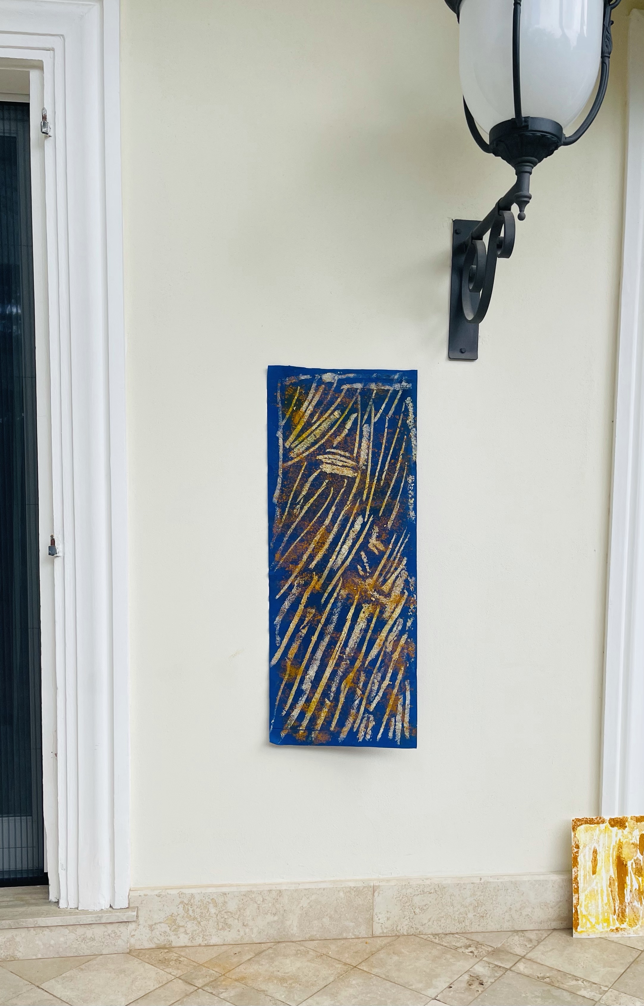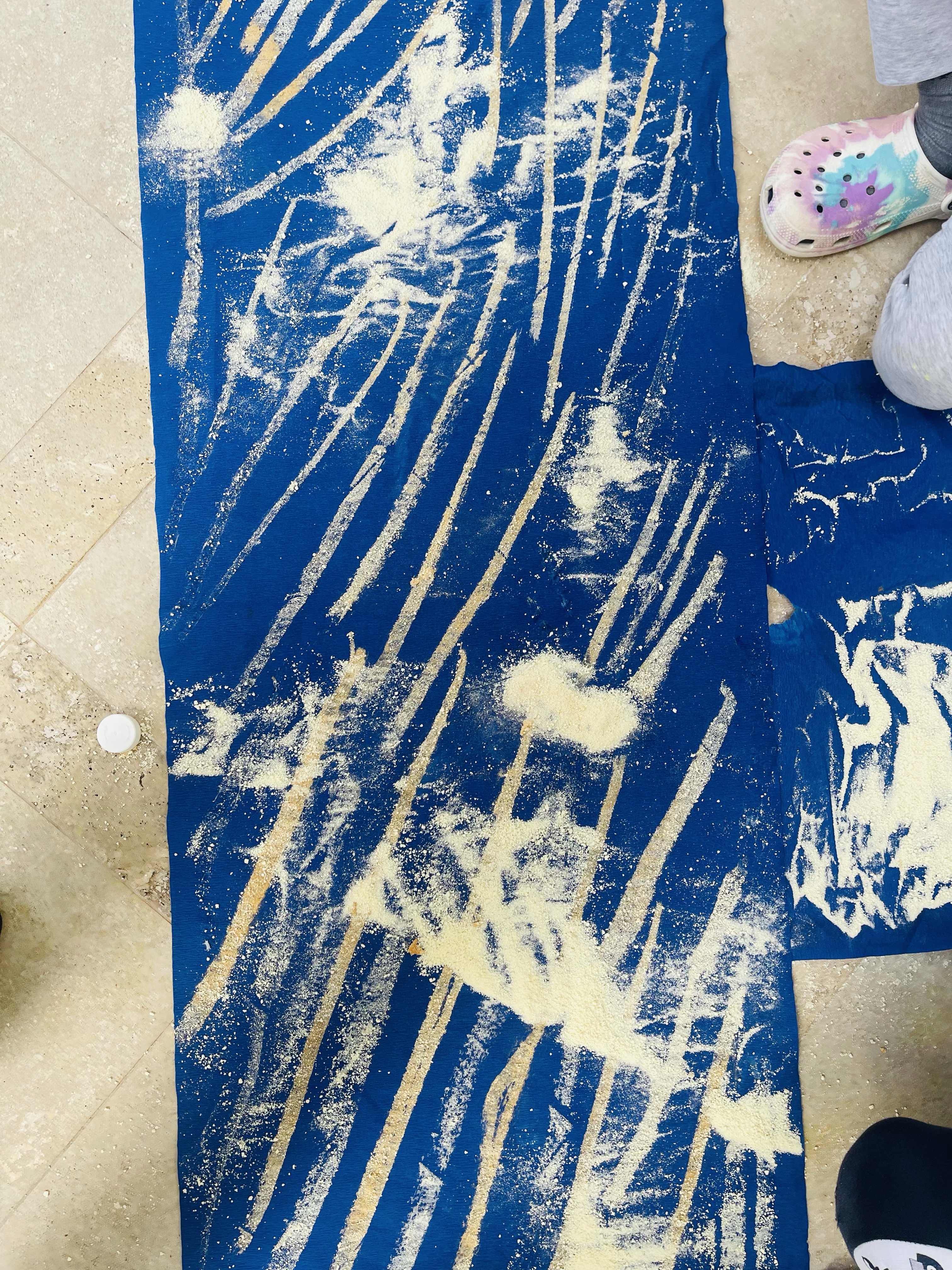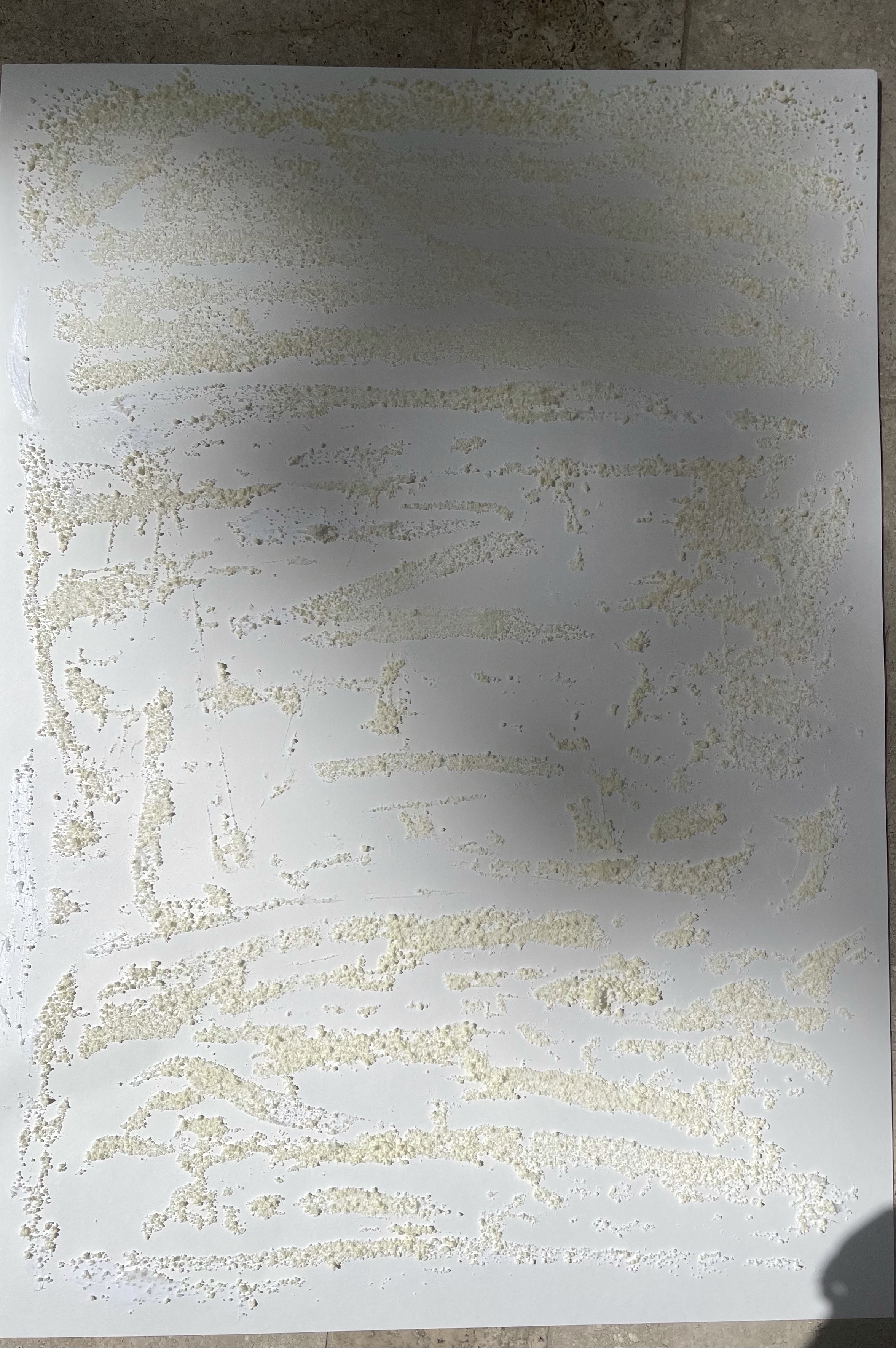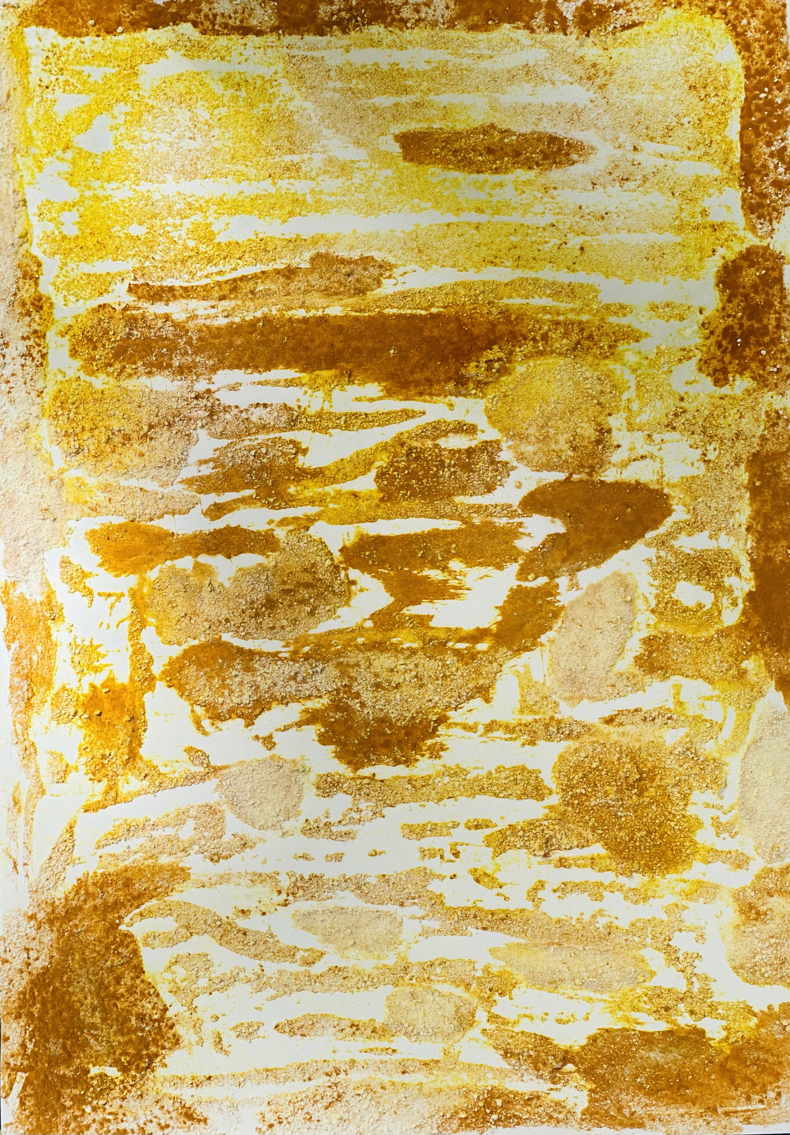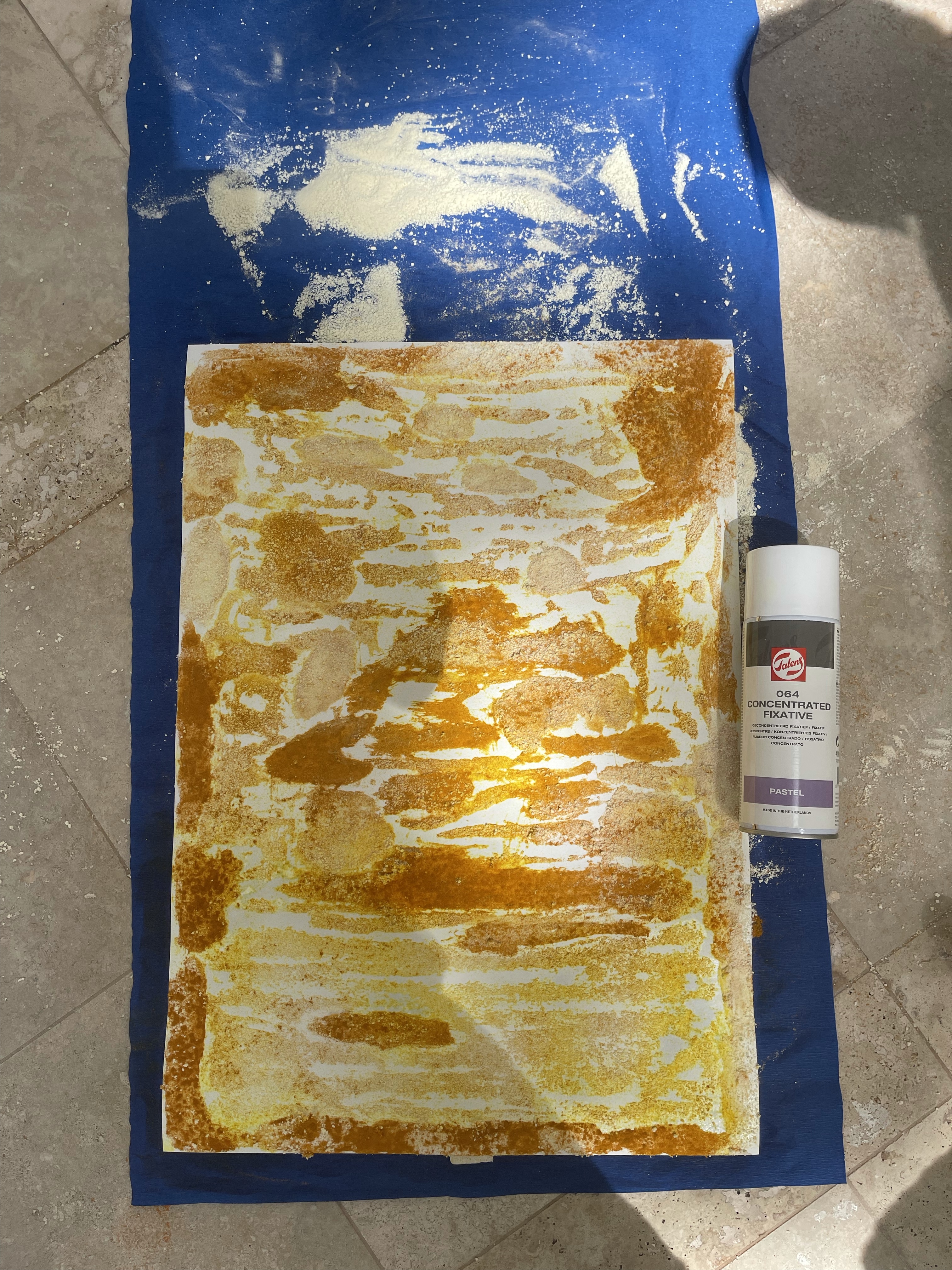 I have sprayed the surfaces above with my dry pastels fixating spray from Talens. Sprying moistened the turmeric spice and it realised the pigment on the surface, creating additional interesting effects.