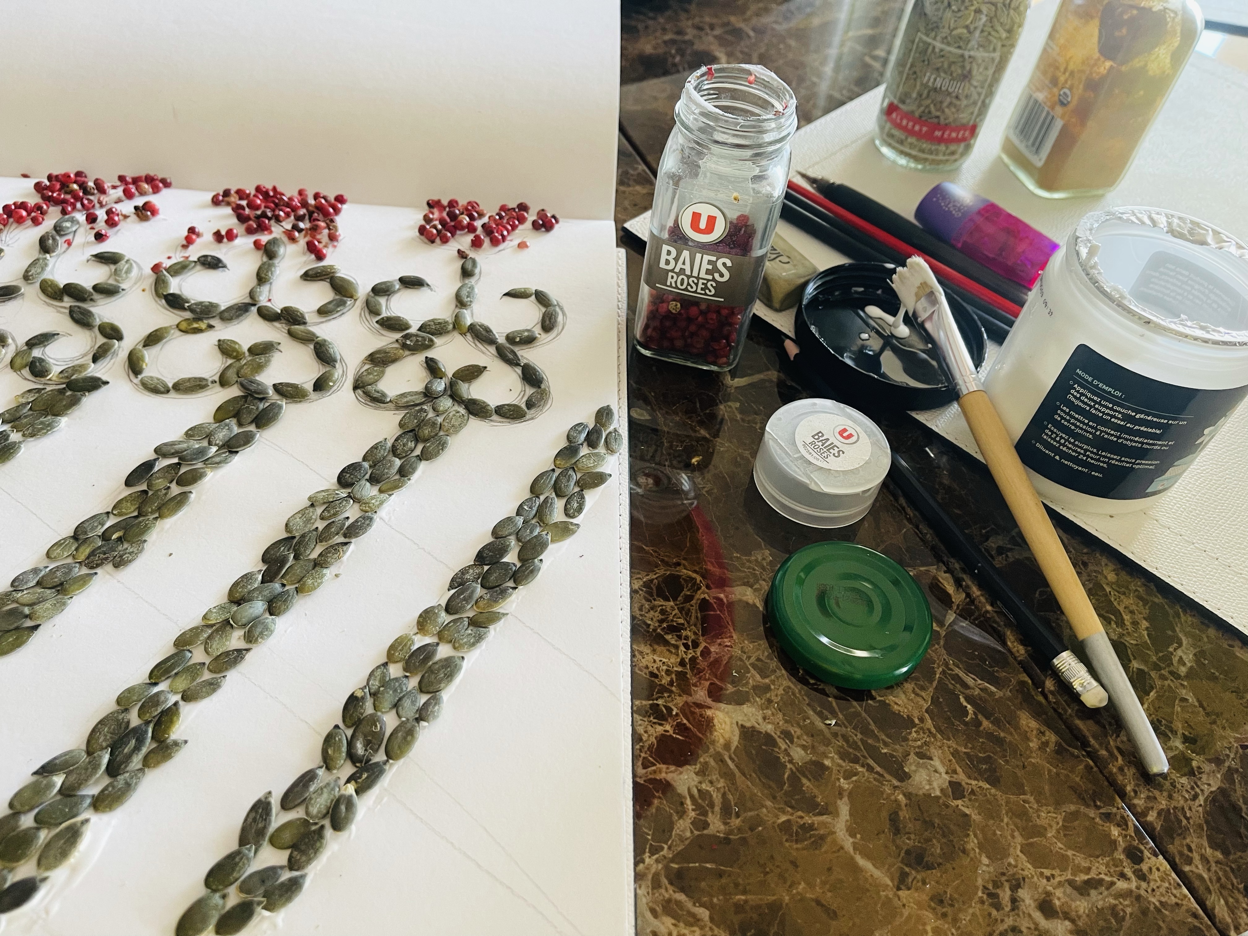 Below you can find some outcomes and my work in process. I was very much attracted by shapes and colours of spices and seeds. I placed them on white PVC glue.