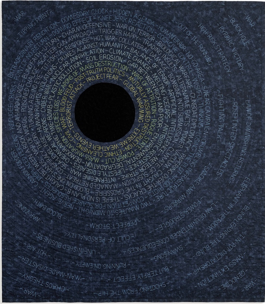 Below I put some of her works, from left to right: “War of Words”, Sara Impey, calico, whole cloth, free-motion machine, stitched, machine quilted; “Project Fear”, Sara Impey, cotton, velvet, free-motion machine stitched, hand and machine pinned and quilted;