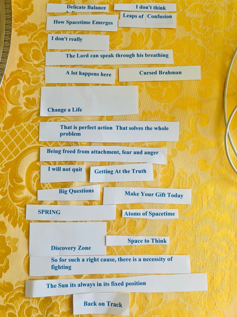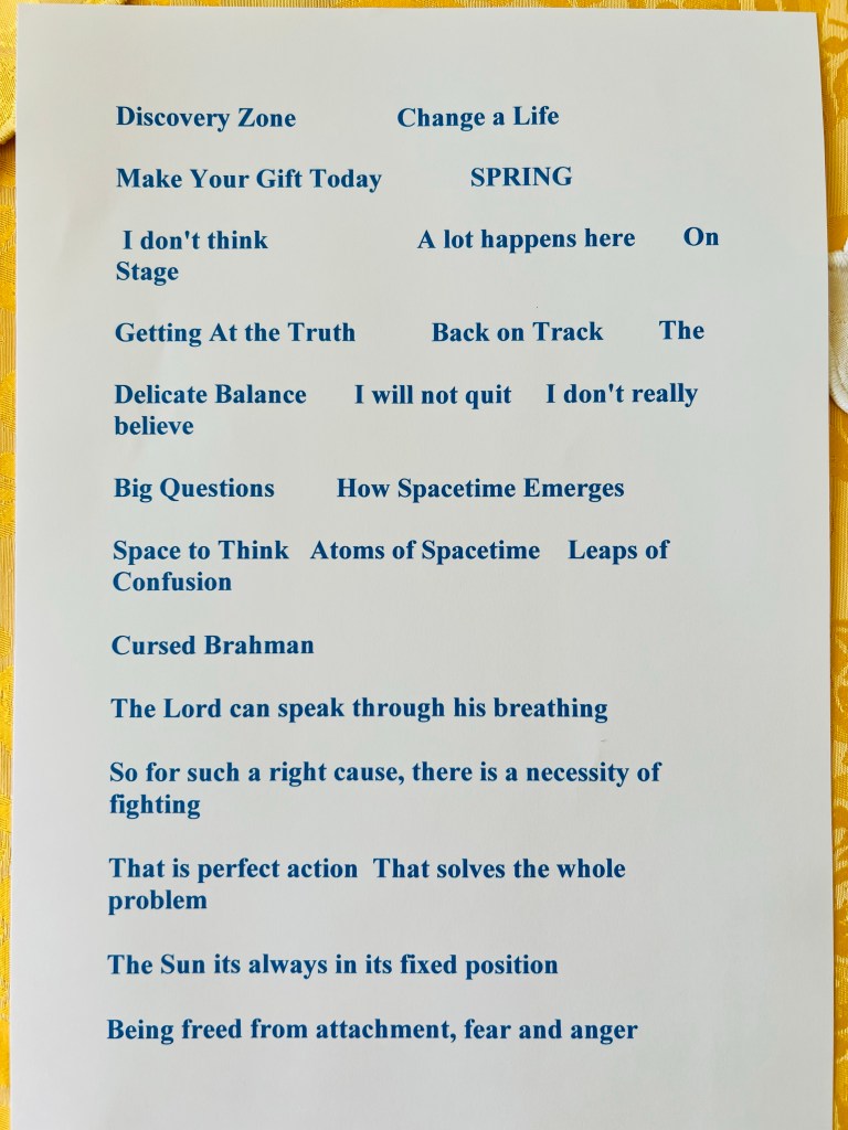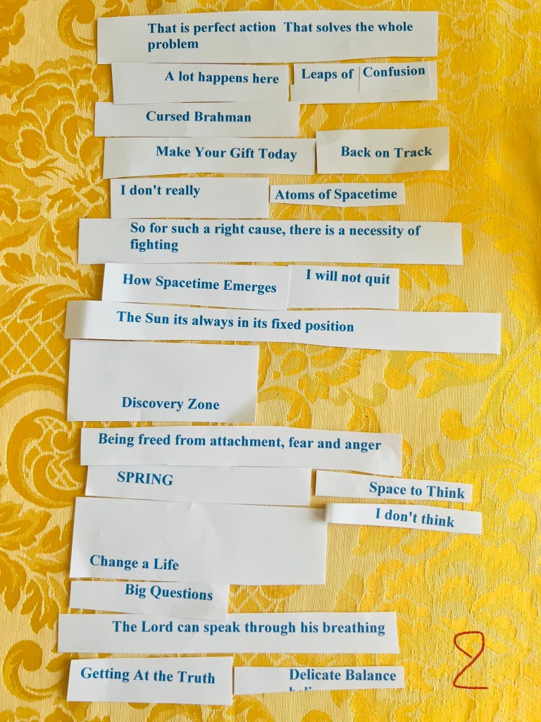 Exercise 1. Cut-up technique. Below are the phrases and words I used for the exercise. I found them in the school magazine of my daughter’s boarding school, the Scientific American magazine (March 2022 issue) and the “Bhagavad Gita as it is” written by His Divine Grace A.C.Bhaktivedanta Swami Prabhupāda (@1972);
