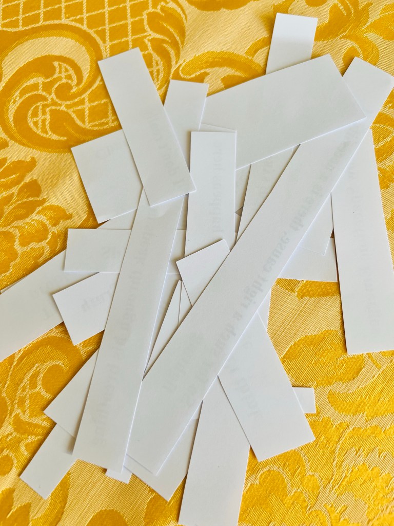 Below you can find the photos of my progress in this exercise. I printed the words above on the A4 size paper, cut them out, turn them down and mixed them. After I started to pull them out randomly and laid them in the order there were selected. Here is the result: