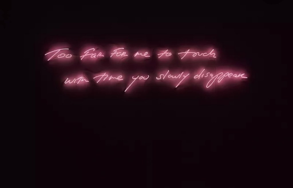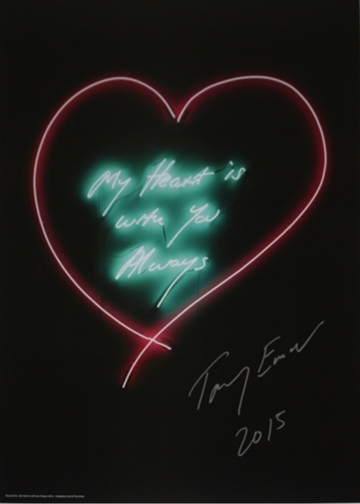 Below I put some of her notable artworks, which are focused on texts. From left to right: 1) “Too Far For me to touch with time slowly disappear”, Tracey Emin, 2019, neon, image via http://www.artsy.net; 2) “My Heart is With You Always, 2015”, Tracey Emin, offset lithograph, image via http://www.artsy.net; [both images accessed on May 25th,2022];