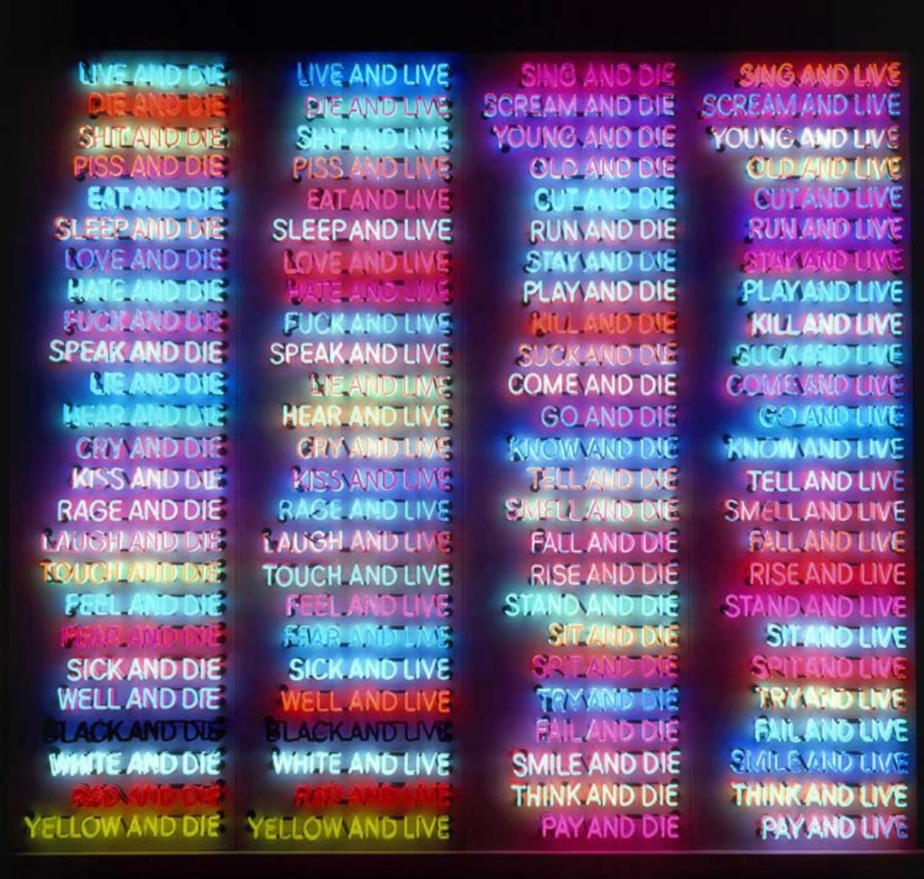 Below I put some of his works, which I found interesting and engaging for me, from left to right: 1) “One Hundred Live and Die”, 1984, Bruce Nauman, mediums: neon tubing mounted, four metal monoliths, image via http://www.thesketchline.com; 2) “Life, Death, Love, Hate, Pleasure, Pain“. 1983. Bruce Nauman, Neon, image via http://www.mcachicago.org;