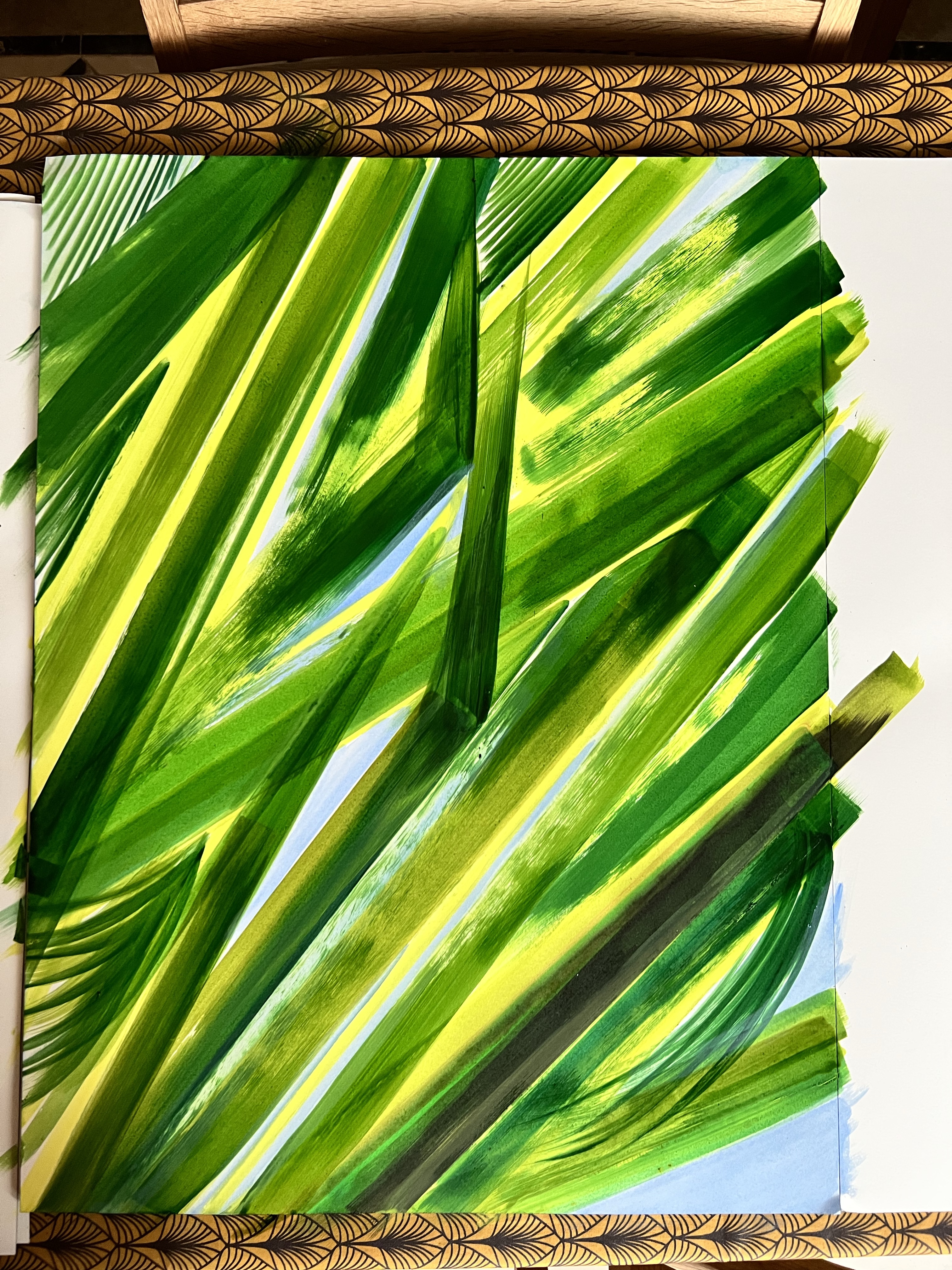 I used the following materials: A2 size multi-medium paper from Fabriano, soft pastels from Sennelier, green ink in “Vert Fonce” from Sennelier, black ink pen 10 mm from UniPen;