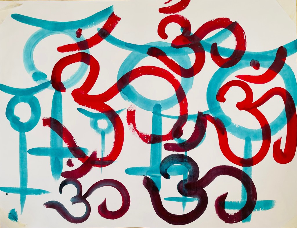 I love symbols and I try to connect with them in my studies of abstract paintings. You see a sign of Lord Budha ( Mercury) and the Divine sparkle. Our Intelligence is at its best when we connect with the Divine. I applied a Japanese Enso painting technique when you have to synchronize your breath with a brushstroke. You can see a green symbol of mercury – Lord Budha and a sacred symbol of “Om”. Our Intelligence is blessed when it is illuminated by the Divine.