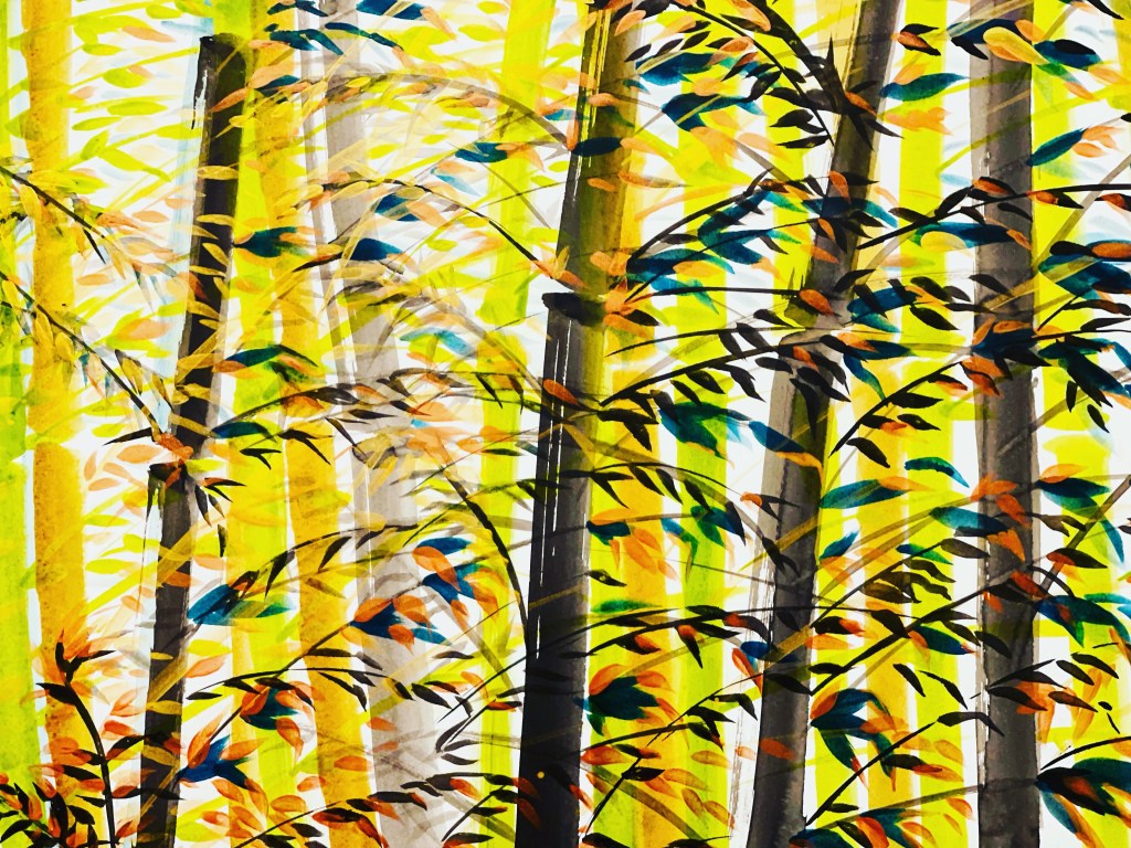 Bamboo forest (ink on paper). Any painting is very much influenced by the time factor. We are not usually aware of it, but the time is always present in any visual art object. Here I sequenced different instant moments what let me to create a complex image. In this painting, I have layered black bamboo stems with evening sunlight and wind and the lightness of the air. I wanted to catch different times of my day in one moment. I painted with ink, which is full of intrigue: you draw a single line, and this line is a multiverse. It is so full of bodily dimensional.