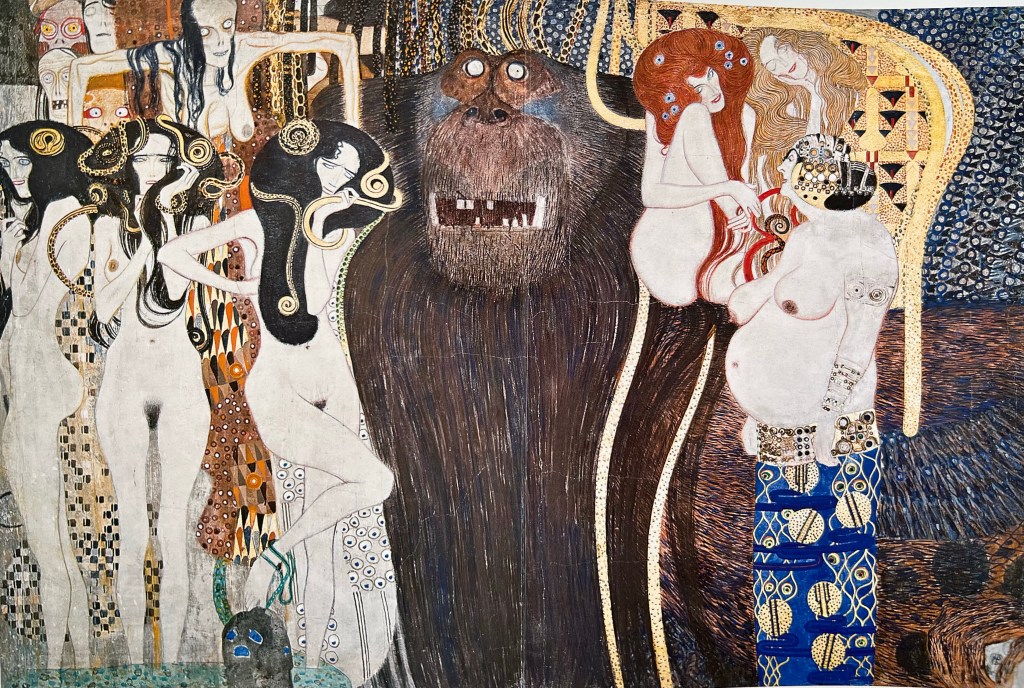 Fig.1 Gustav Klimt,(1901-1902), Frise Beethoven, detail of central part, Les Puissance hostiles et Trois Gorgones. [mixed technique on stucco]. In: Metais, V. (2021) @Editions Hazan, p.17.
