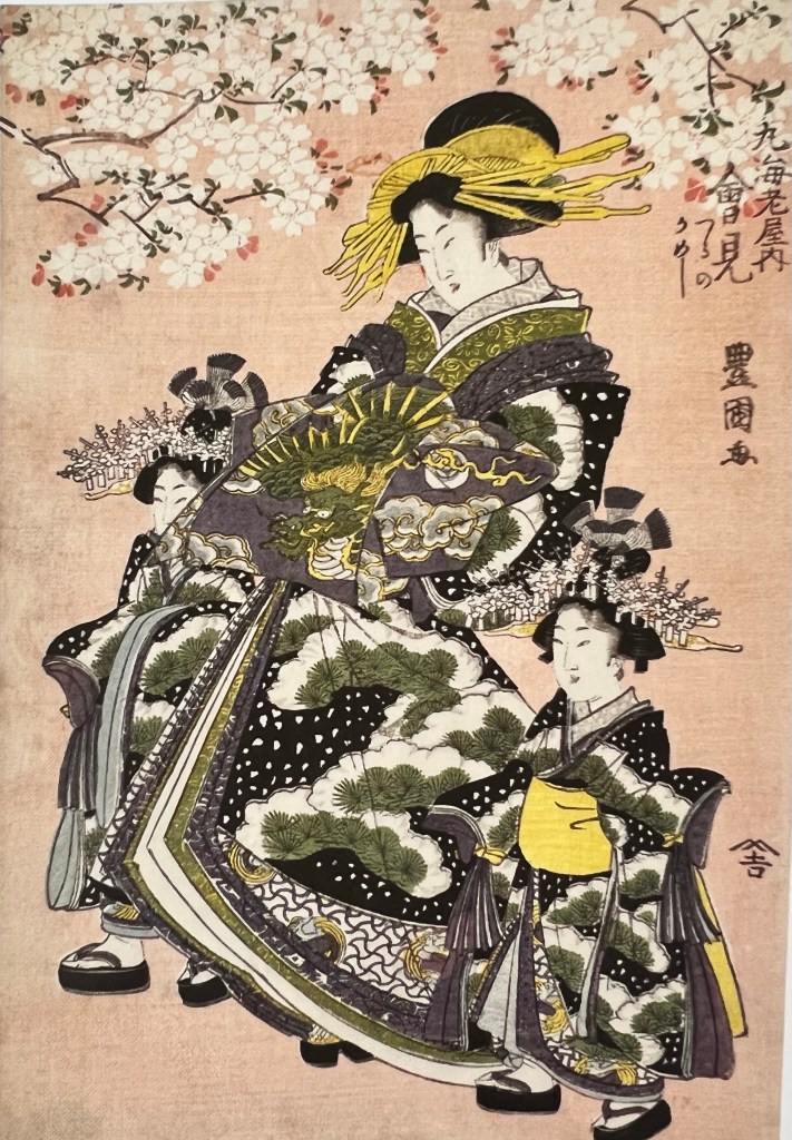 Fig.23 Utagawa Toyokuni I (end of XVIII century), La Courtisaine Aimi de la Maison Maruebi-ya flâne en compagnie de ses deux kamuro, Tsuruno et Kameshi. In: Christin, Anne-Marie, Brisset, Claire Akiko (2021) Paravents Japonais, Par la brèche des nuages, Citadeles & Mazenod, Paris, p.22.