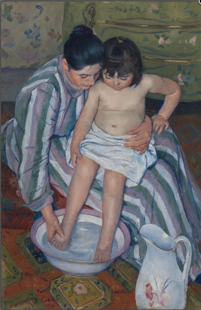 “The Child’s bath”, 1893, Mary Cassatt, oil on canvas; below on the left.