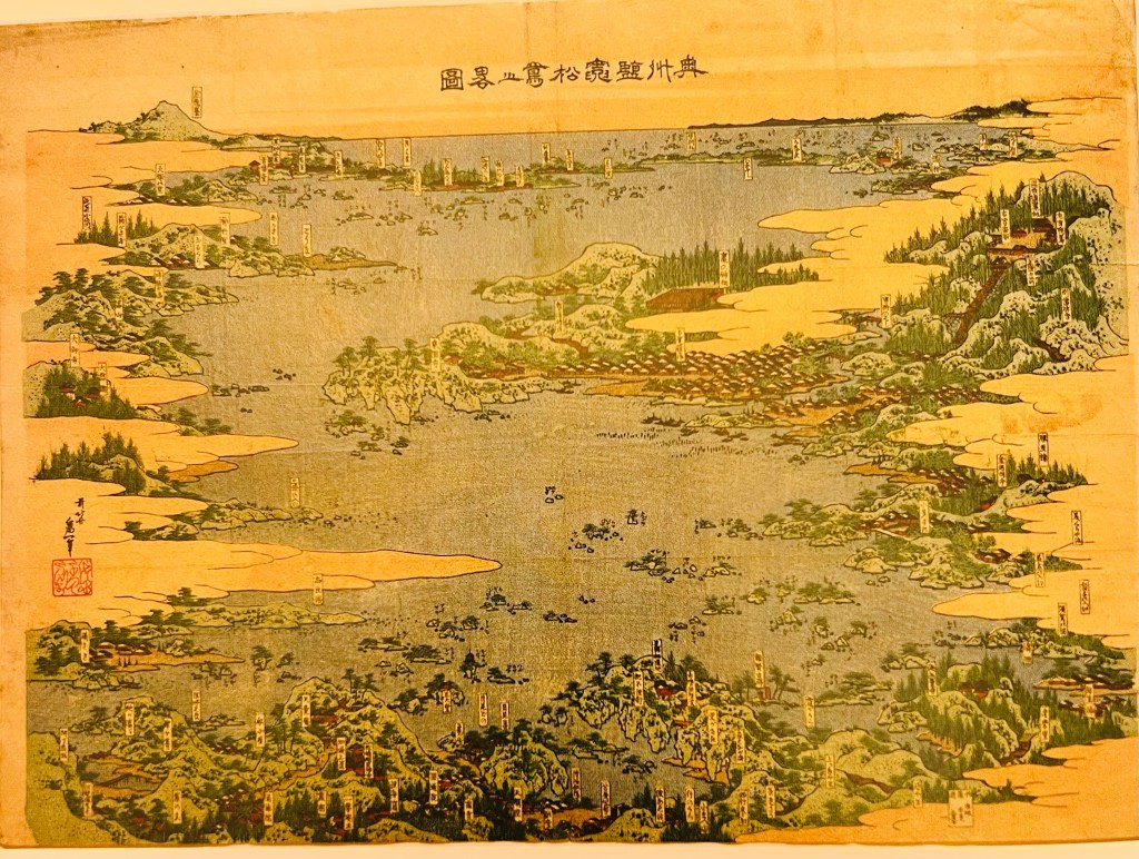 Another landscape painting in the line of my discussion which stands out is Van Gogh’s “Landscape with House and Ploughman”, 1889, oil on canvas, below on the left. I find this landscape a powerful painting created against all traditional rules of perspective. The viewer’s point is lifted up, so we can view the patchwork of land plots as we do so in the aeroplane. This viewing point is typical for Japanese landscape paintings, where we can have this panoramic view of details on the surface. A good example is below : “The Old Shrine in Shiogama and The bay of Matsushima from a Bird’s-Eye-View”, 1824-33, Katsushika Hokusai, colour woodcut; below on the right.
