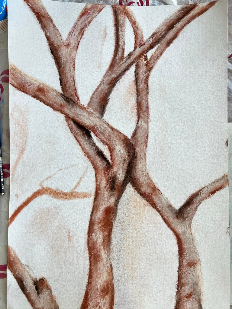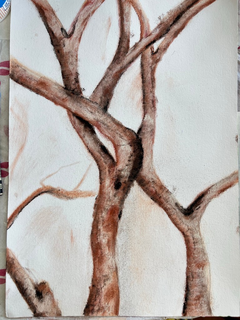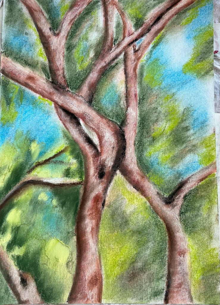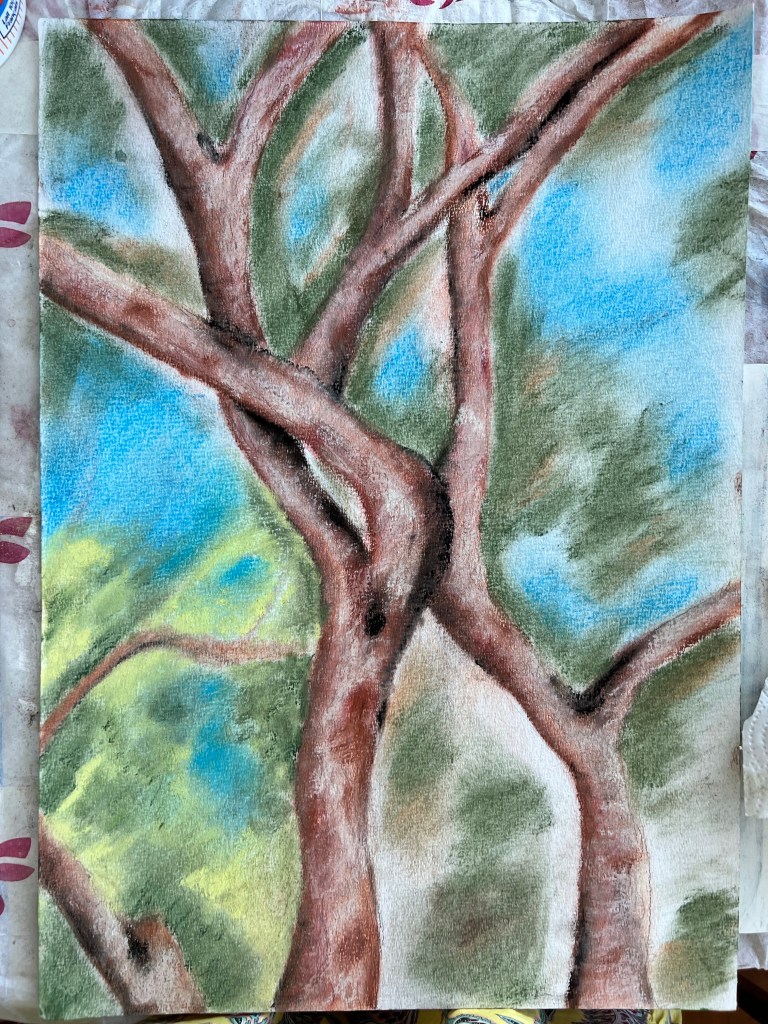 Another trial for a tree as a continuous narrative. Soft pastels and inks on paper.