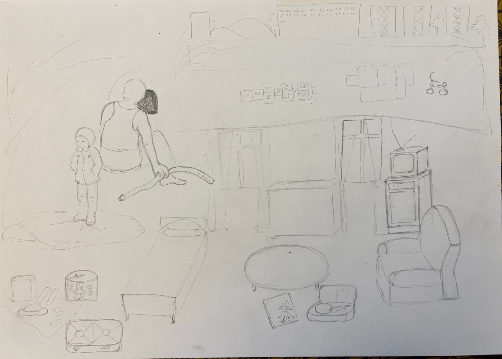 Below is my another drawing for this exercise about continuous narrative. I used A3 size mix media drawing paper from Canson, blue ink pen, HB pencil ands of pastel pencils Gioconda 24 from Koh-I-Noor. This a story of my childhood, which I spent as a child, living along with a clinically depressed family member. There is a quite strong personal narrative unfolding on the paper. This drawing I consider representing a continuous narrative since it depicts different scenes in one frame.