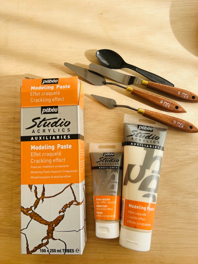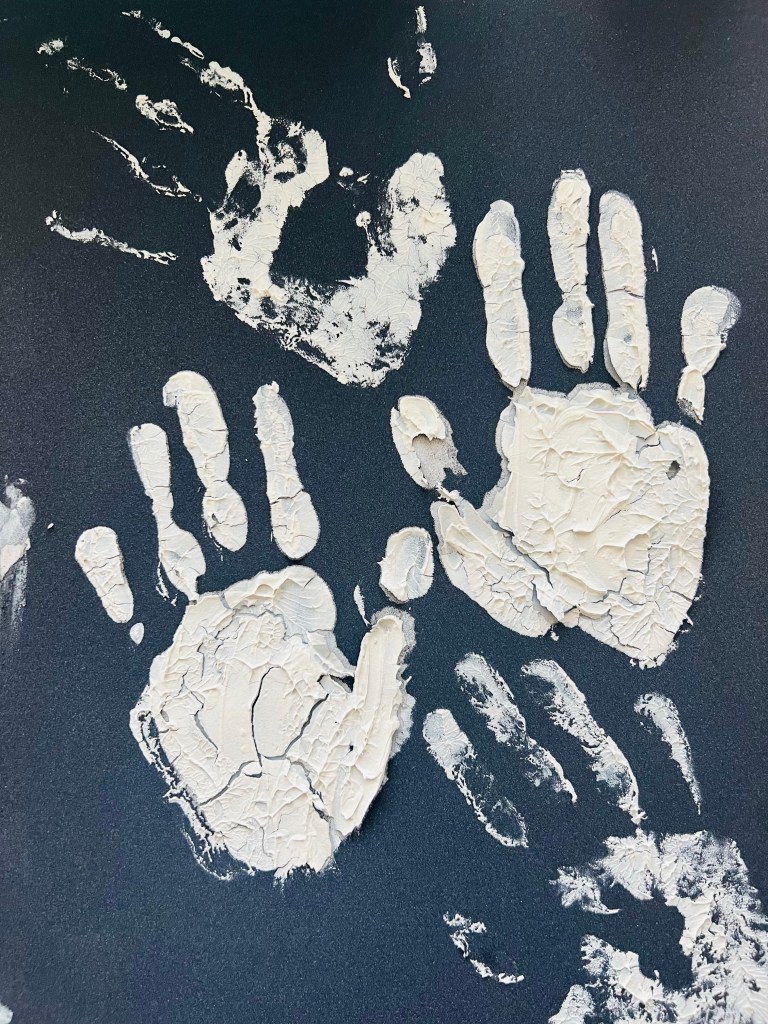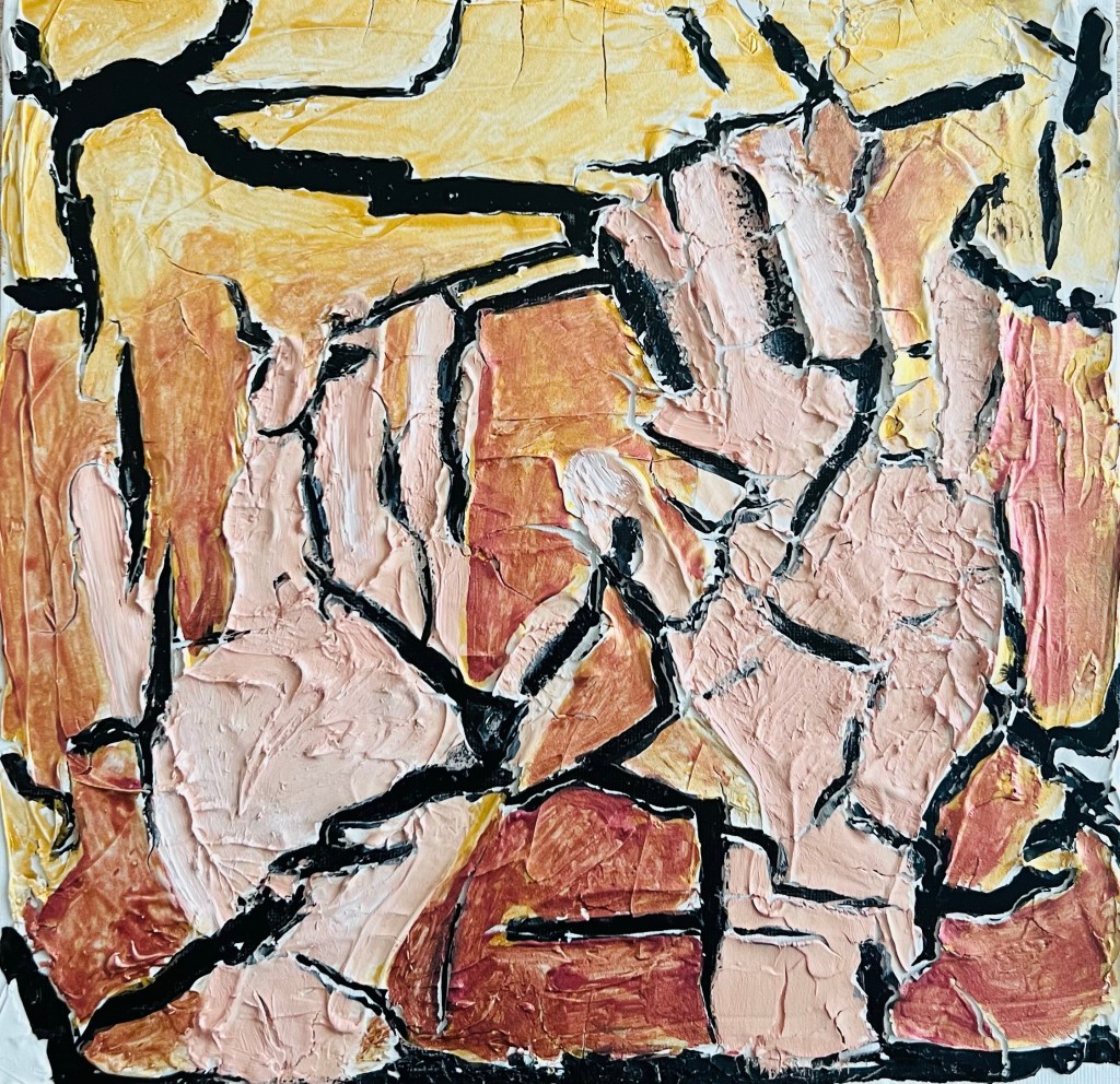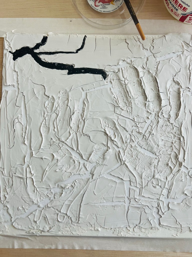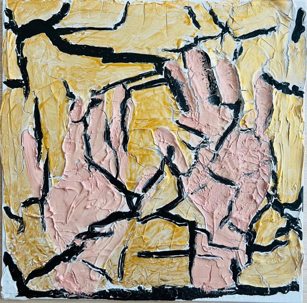 For this exercise I decided to use a new material and a new approach/technique, trying the Pebeo modelling paste with the cracking effect. Below is my work in progress. I applied the modelling paste and left traces of my hands. The cracking effect looked engaging. I those cracks all over the surface I saw the unmanageable reality when my efforts to control or change it just fall apart – cracking hands. To emphasise the drama of being helpless I added Nan King black ink (Lefranc Bourgeous) into the cracks. For hands I used oil paint #577 from Daler- Rowney.