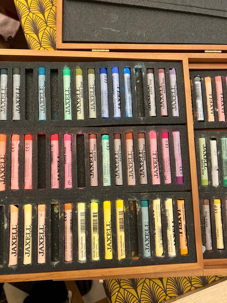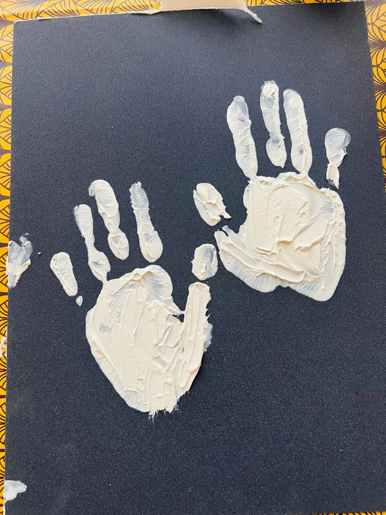 Then I felt I must add blue and gold. The hands’ traces on the top and bottom part I transformed completely using an amazing shade of blue soft pastel and applying on the modelling paste pieces a gold colour ink. The drawing was transformed dramatically and looked much better. The blue hands are God’s hands which support and guide my ( human’s) hands. The idea and its implementation came out just very intuitively, suddenly upon my mind. I was listening Lord Krishna mantras while working. I think the drawing below is one of my best works so far.