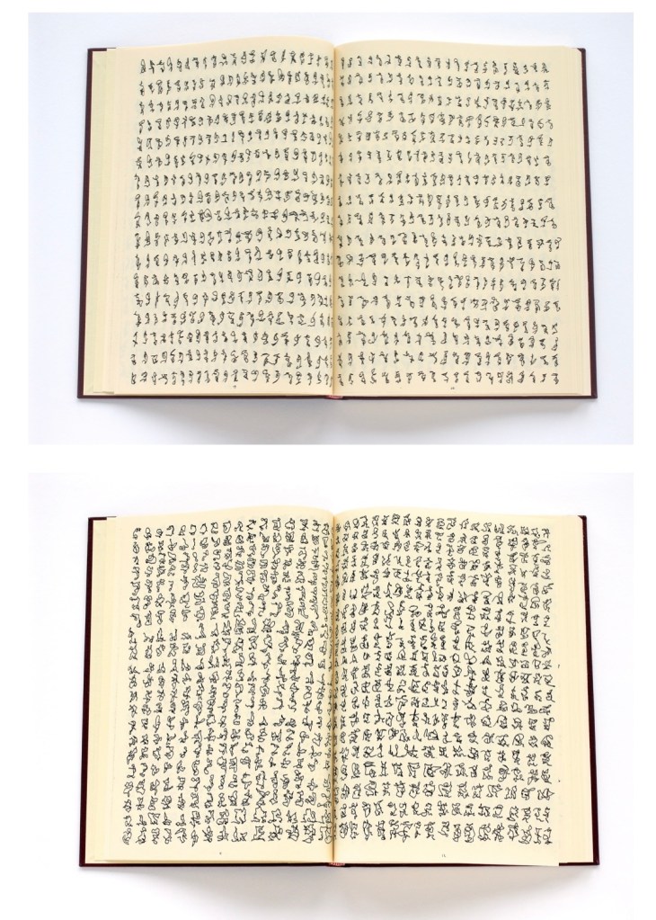 Axel Malik is a German artist who is famous with his unique “The Scriptal Method” he employees for creating his artworks. He studies the process and essence of writing as a complex phenomenon, he describes it : “When script is divested of its semantic core, the motion of writing instantly implodes … an expanding intensity of the moment. It is all about unobscured reality of the bare and sheer motion of writing.” (Axel Malik, On My Work, http://www.axel-malik.com). On his website http://www.axel-malik.com you can find a video of his writing process. He is not focused on producing phrases and words, he immerses himself into the pure action of writing. Below are some of his works, from left to right: