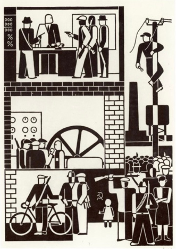 Below I put some of Gerd Arntz’s artworks, from left to right: Fabrikbesetzung, 1931, Gerd Arntz, original woodcut, image via http://www.artnet.com; Schleppkahn, 1924, Gerd Arntz, block from wood painted in colour, image via http://www.artnet.com; Avondvaast, 1937, Gerd Arntz, woodcut, image via http://www.artnet.com;
