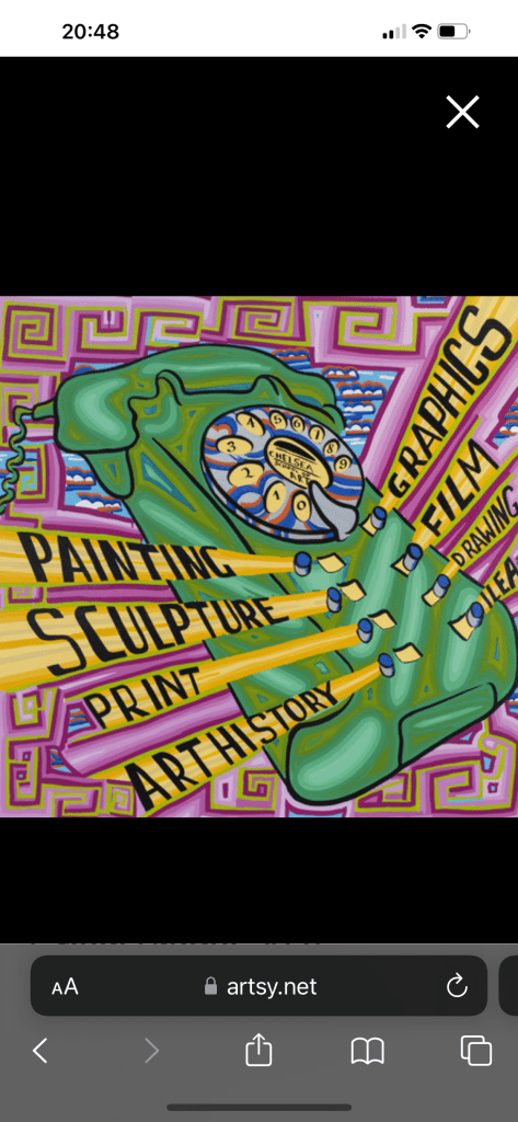 Patrick Brill is a British contemporary visual artist, writer, musician and author, known as “Bob and Roberta Smith”. He had his formal training in visual arts as a sign Painter in New York. He also studied at the University of Reading and Goldsmiths College. As it is said at the RA website article about Patrick Brill, he :”…uses text as an art from, creating colourful slogans on banners and placards that challenge elitism and advocate the importance of creativity in politics and education”. His artworks have been presented in numerous solo and selected group art exhibitions worldwide. He is well known for his art education advocacy. Some of his artworks are below from left to right: Green Phone,2021, Bob and Roberta Smith,Sign-writers paint on wooden panel, image via http://www.artsy.com; Art is your Human Rights, 2021, Bob and Roberta Smith, Sign-writers paint on wooden board, image via http://www.artsy.com;