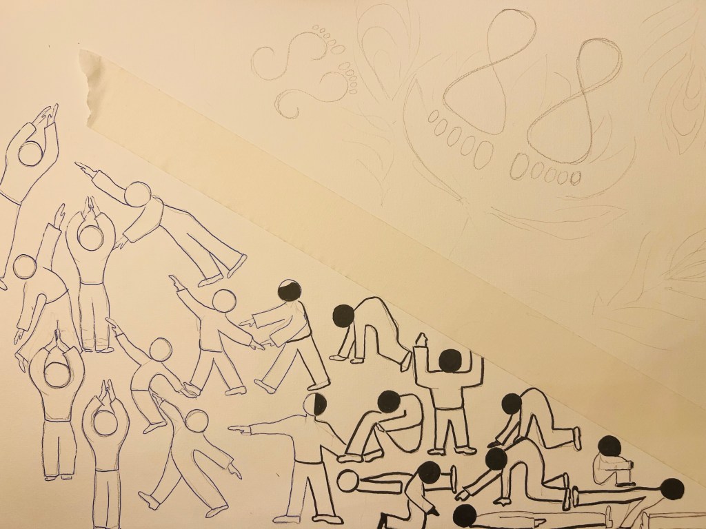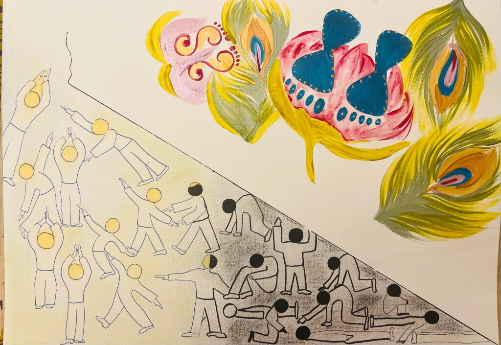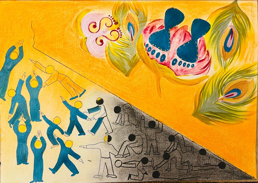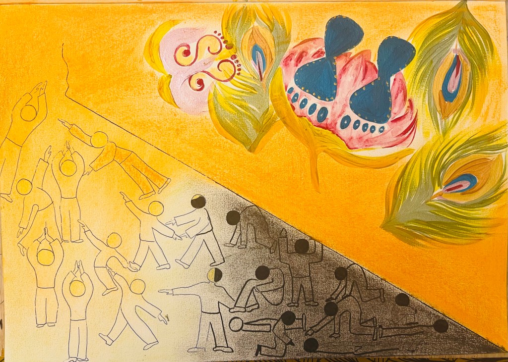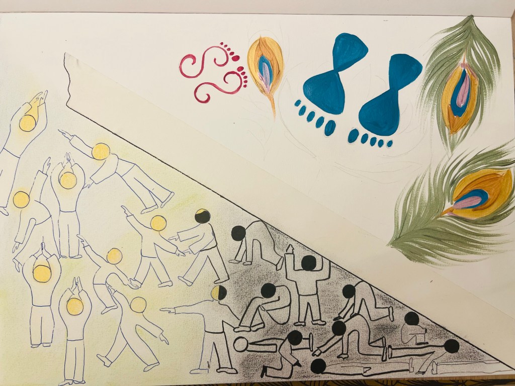 The Upper plane is God’s reality. To designate God’s space I used symbols of His Lotus Feet – you can see them in dark shiny blue. There are also Lakshmi’s feet or Radha’s feet – the eternal beloved of God. These feet symbols are common for “rangooli” patterns people in India draw for their religious festivals, specially on Diwali and Janmashtami. Thus I borrowed them into my drawing, which was appropriate since the whole idea was to communicate with a viewer through the diagram. For the Upper Plane space background I used orange pigment soft pastel stick because orange in Hindu and Buddhist tradition is a colour of God, a holy and powerful colour.