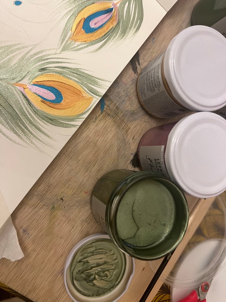Then I wanted to develop my hands’ traces into something opposite to frustration and anger, to something happy. I ended up with a quite spiritual work. I was listening to Hare Krishna mantras. Listening while painting is my usual practice.