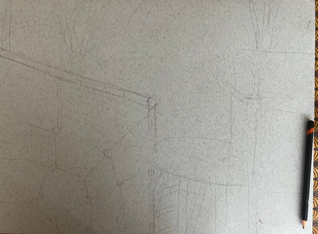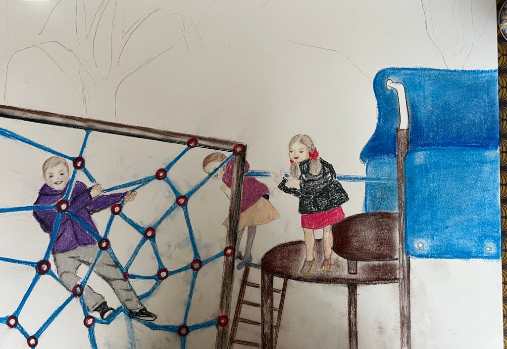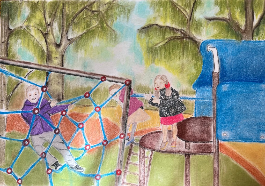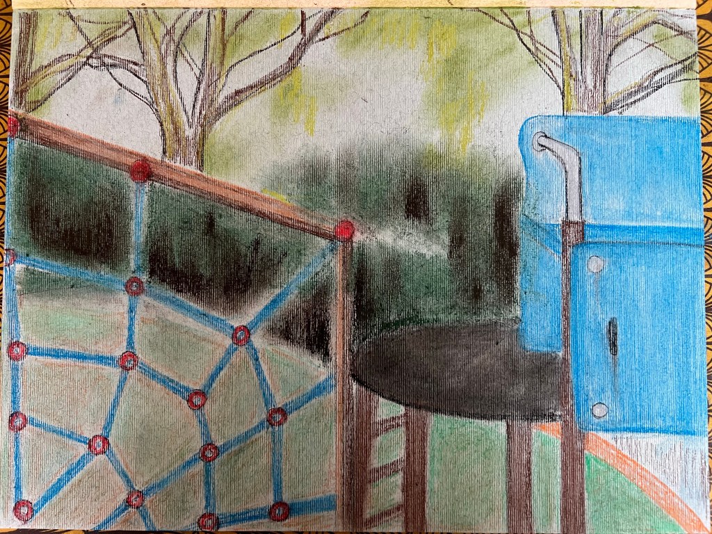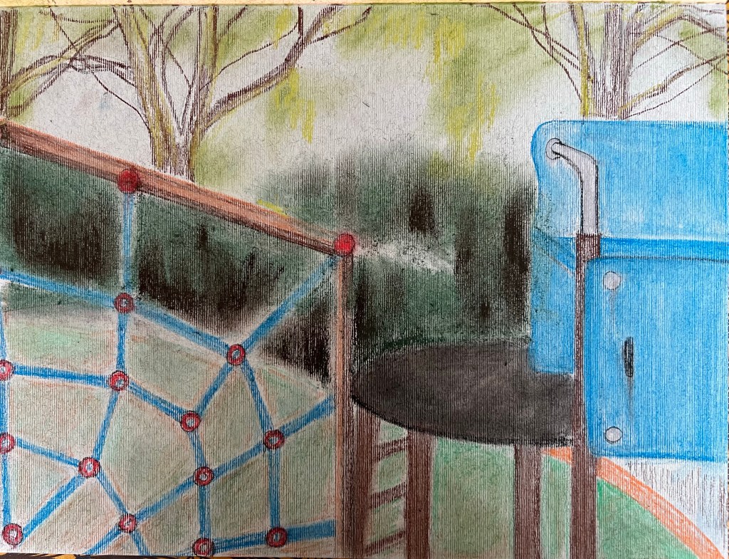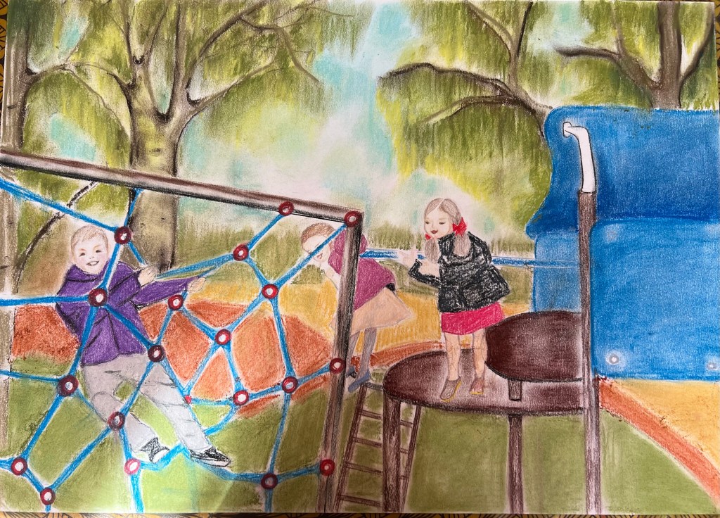 I decided to draw a landscape which was a playground in Regents Park, London. I was attracted by the forms of the objects installed at the playground as well as by the park’s atmosphere. However, the cityscapes with skylines and busy streets overcrowded by buildings didn’t inspire me. Below are my studies using Giokonda soft pastels pencils, soft pastels from Jewel and A2 size multimedia paper from Canson. I opted out of using soft pastels because this medium has a certain “kids” vibe, which I found and felt appropriate to use to depict the details of the playground. The playground’s items, which children use for their play, have distinctive shapes and colourful appearances. So ink or aquarelle won’t bring the mood of the playground how I wanted it to be.
