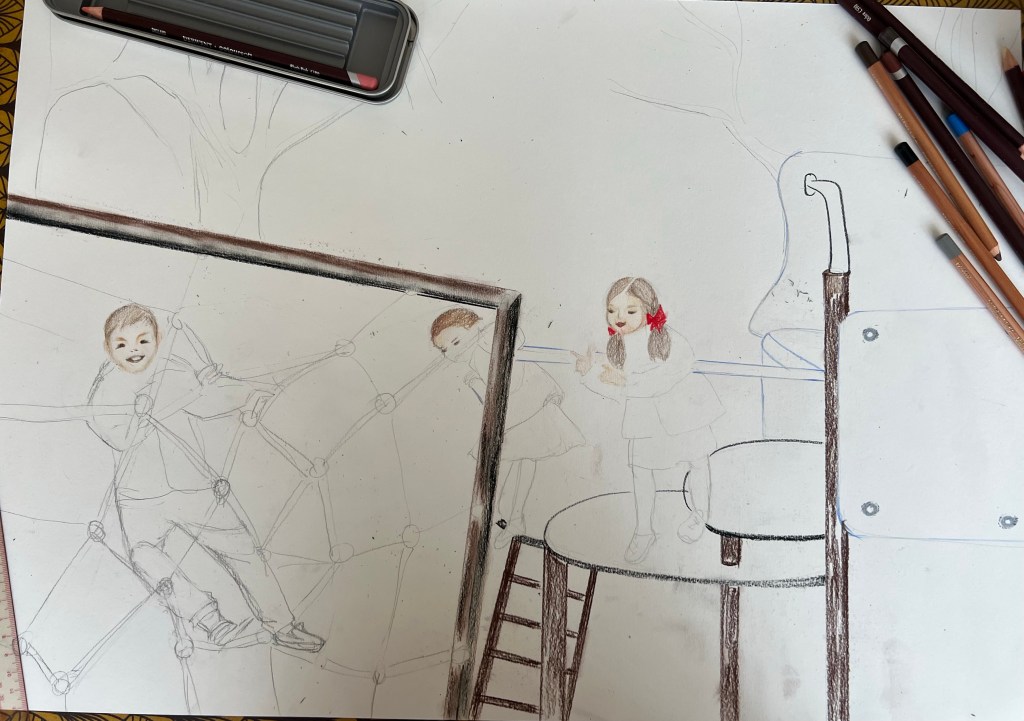 In order to paint kids’ faces and hair I used my set of “colour soft skin tones” pencils from Derwent. The photos below are made in next several days. I was thinking about how to depict the trees and decided to continue with pastels, but experimented with strokes and applied the pigment in different way. It is always a great challenge for me to draw human figures. This drawing didn’t come as an easy one for me. It took some time to develop kids’ moving figures. I like how I did the boy and the girl bending from the slide; you can’t see her face. The other girl in the black jacket didn’t come out well; I struggled with her pose and right leg positioning.