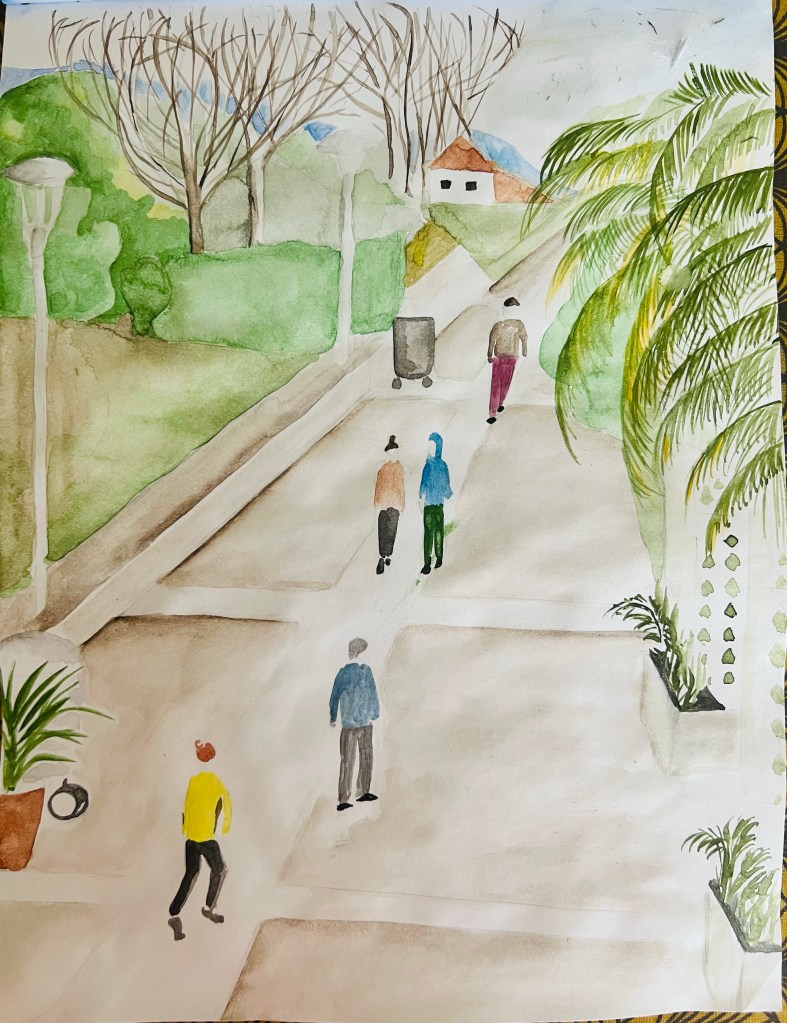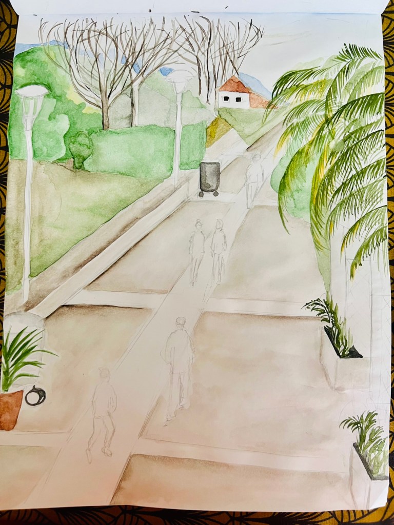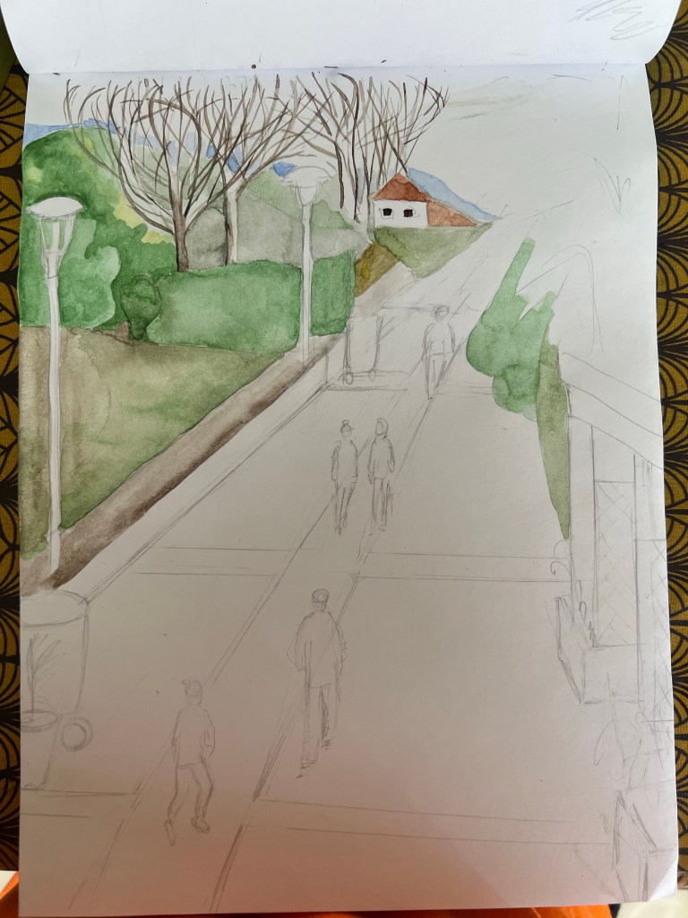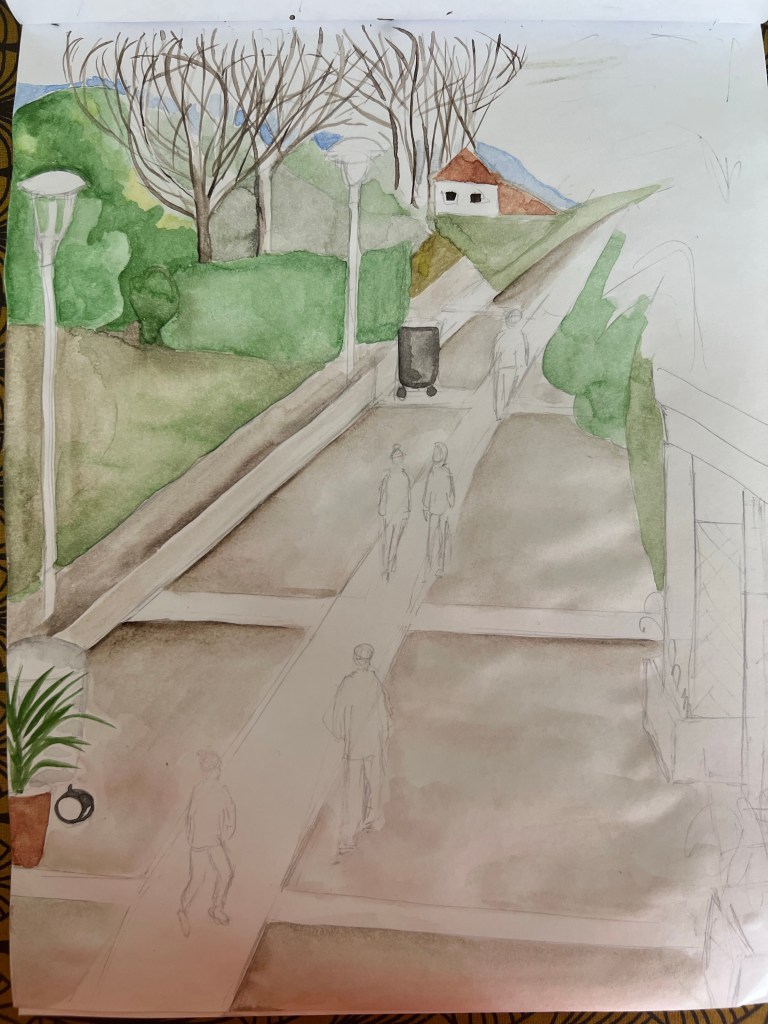 Another changing landscape study is below. I picked up a scenery of small promenade in my living area. That was a good opportunity to work on linear perspective. I also wanted to work with a different medium and opted for aquarelle to bring the February mood, when everything around is a bit pale. As usually, it took some time for me to construct the lines for perspective .