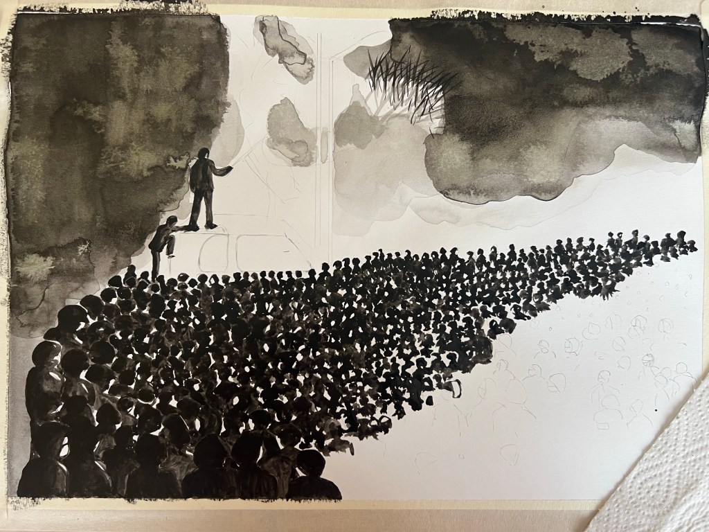My study of crowd, painted with black ink: January 2022 protests in Kazakhstan. Ink, ink pencil, soft pastels on paper. Reference photo is below