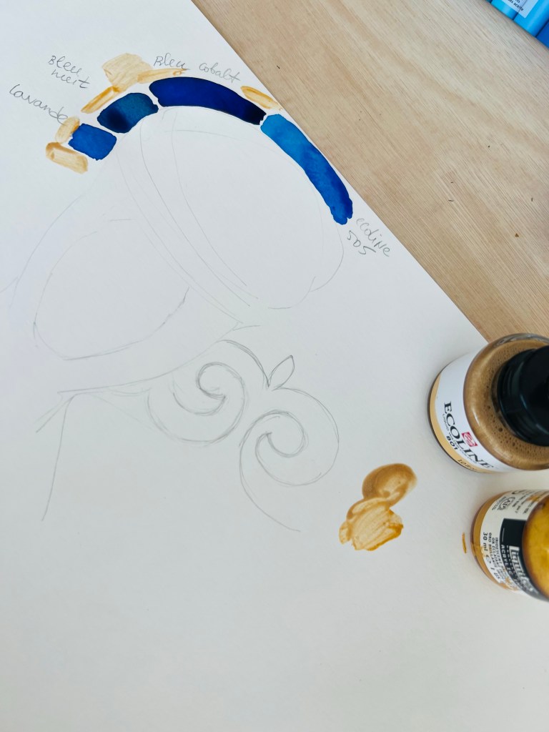 I wanted to represent the woman’s figure as a Goddess, outlining the idea of motherhood, which is in its turn is symbolised by massive clean white headwear in Qazaq culture. This type of head wear signified a status quo of being a mother. My idea was to create a background, which would complement the white colour of the headwear and reveal my story of motherhood since this is a main area of my life to be unfolding so far. I was thinking about the blue colour and tried different mediums on a separate paper . I also tested how can move forward with a face. For the background I tested different shades of blue ink and a blue oil stick. Out of four different options for blue I liked the Éclats, Bleu Cobalt ink from Herbin, it gave a nice smooth dark blue colour I was looking for. However the oil stick gave an interesting texture with a perfect royal blue color.