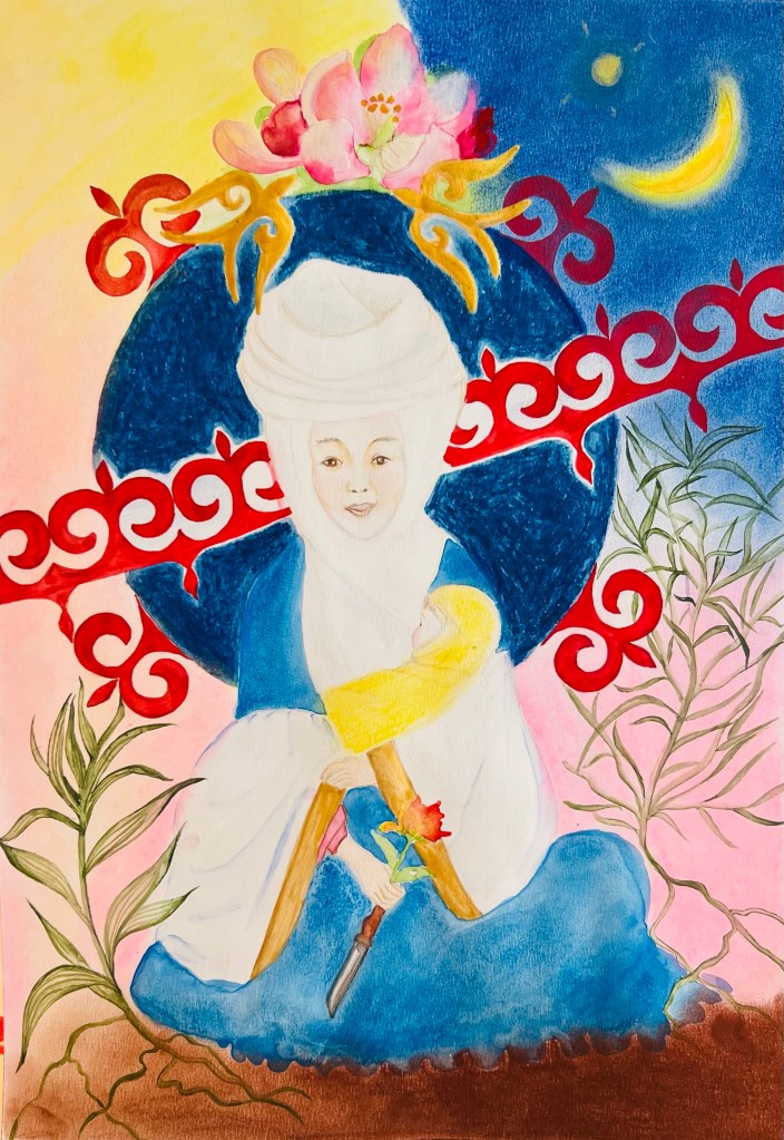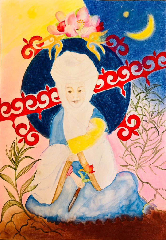 I changed hands position because I decided to unfold the story more, adding detail such as a knife and placing it in the right hand. The symbol came to me as a part of my reflection on the Qazaq female legacy, which is about being kind and open but at the same time tough and decisive if needed. I made a deliberate dissonance between the kind facial expression and the hand holding a knife – a weapon. I picked up the knife as an object to incorporate into my drawing because I could make its handle like a flower, which is also controversial. I like to bring controversy to the paintings. The knife as a weapon anyone uses at a close distance shows that we accept people and let them get close to us. I added a Qazaq ornament – two bird-looking pieces around the head to show the elevation of the mind and consciousness.