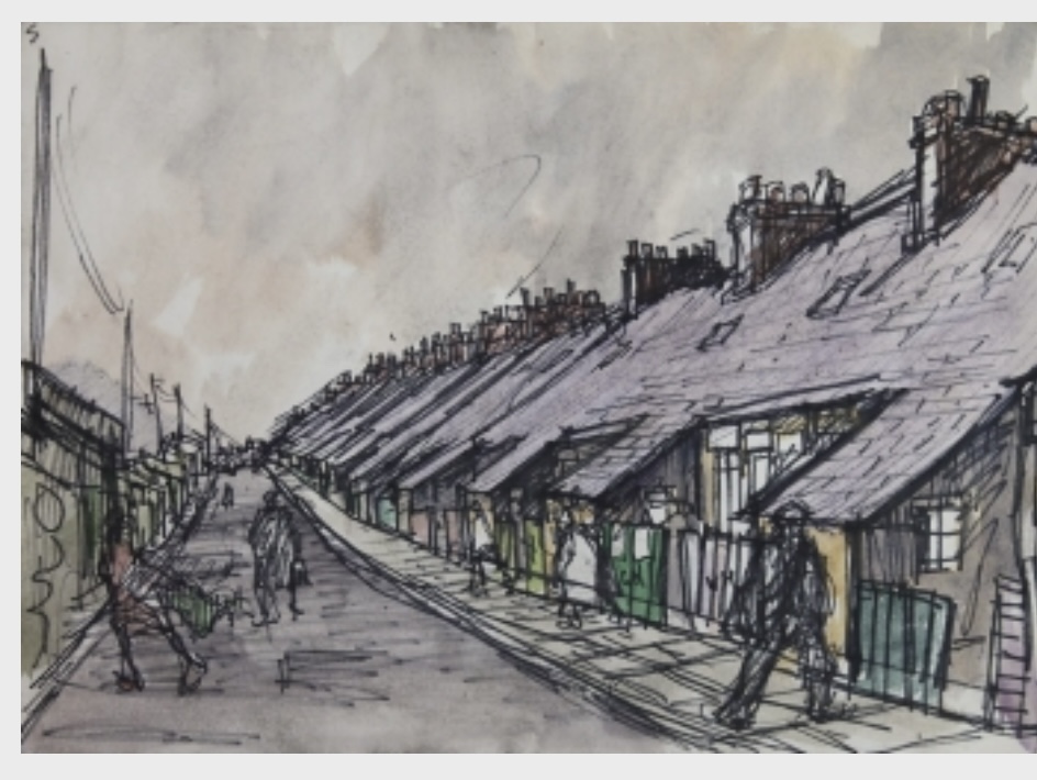 A Back Lane, Norman Cornish, ink and watercolour on paper, image via http://www.artuk.org;