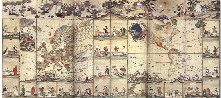 Above is a Continental Map with Scenes of Forty-Eight Foreign People (America and Europe), late 18th century, manuscript ( a pair of six-fold screens), Kobe City Museum; image via http://www.myoldmaps.com;
