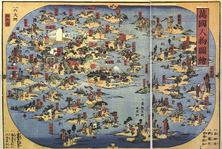 Bankoku Jinbutsu Zue (Map of the World), 1850, woodcut, 33*48,5 cm, image via http://www.myoldmaps.com; above