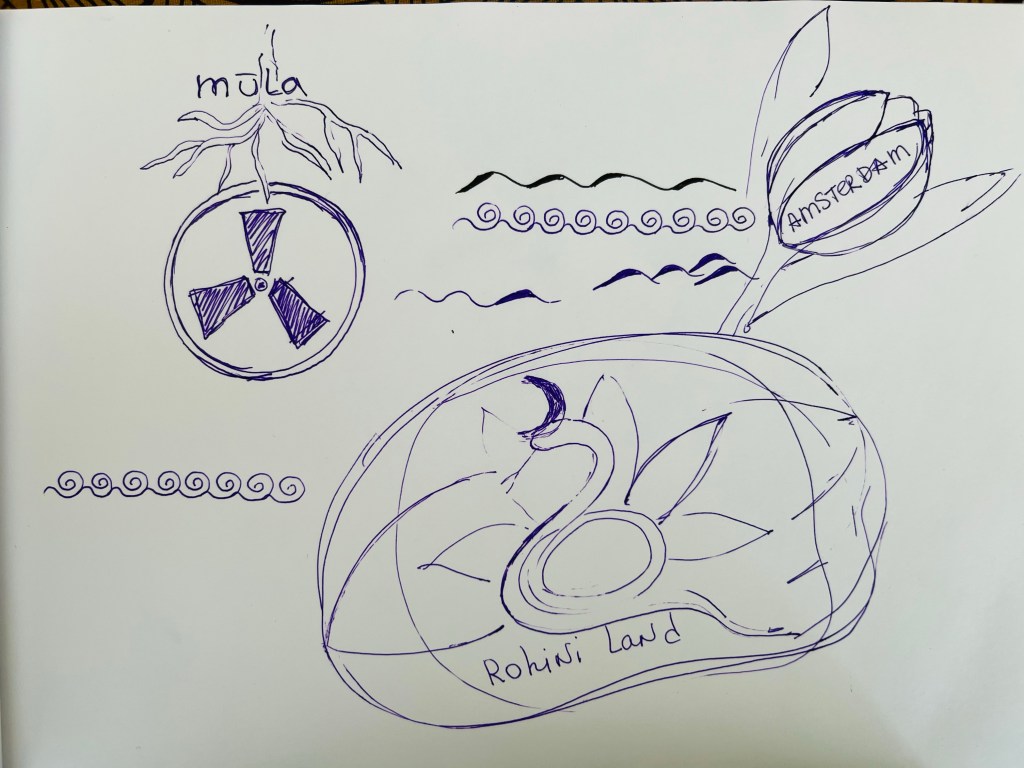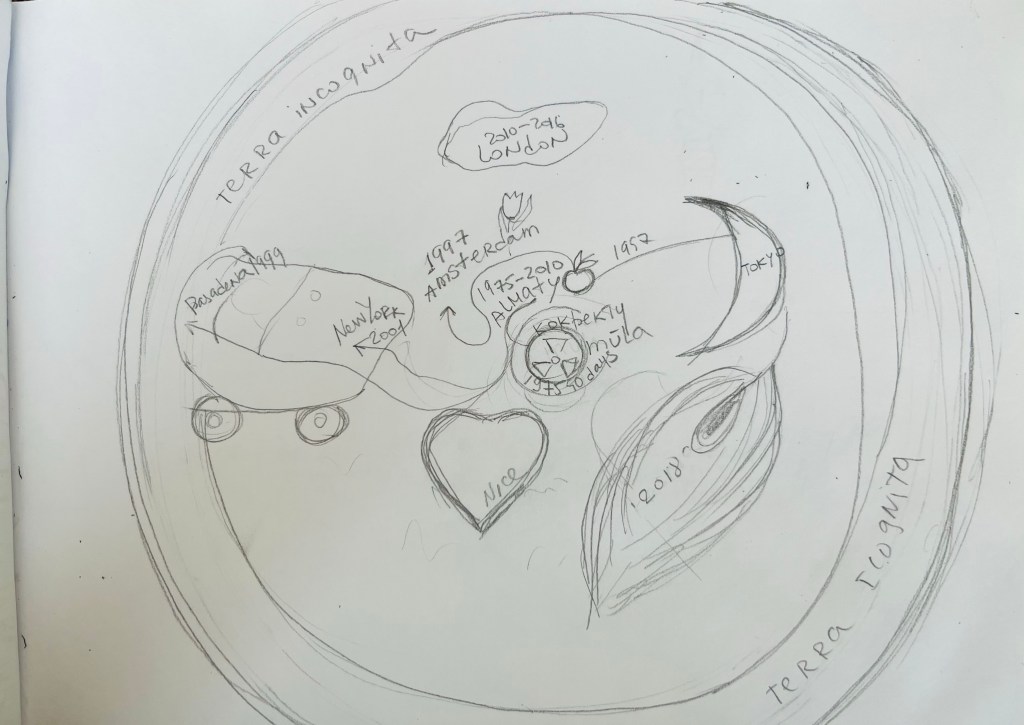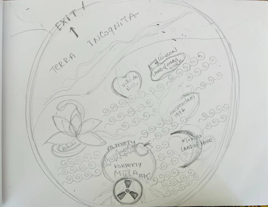The outcome as a map appeared different from the sketches. At the bottom, I placed “1975”- my birth year. I was born in Eastern Kazakhstan, near the Semey region – a place known as a Soviet nuclear weapon testing site. Also, the atomic energy sign connects well with Nakshatra by birth (an astrological term for Moon’s position at the time of native’s birth), called “Mula” Nakshatra. The Mula Nakshatra is associated with roots and powerful, intense energy coming from the centre of our Galaxy- the Milky Way. Thus for these reasons above, I placed a symbol for nuclear power danger and a drawing of a bunch of roots. I put the word “EXIT” in the upper right corner, which means the end of life. The large part of the map I named as “Terra Incognita”- a Latin saying about unknown land. The peacock feathers symbolize my Faith and spiritual aspiration, my hope for my Soul’s liberation after death. The visual language of my drawing was determined by the elements I found in the maps above: