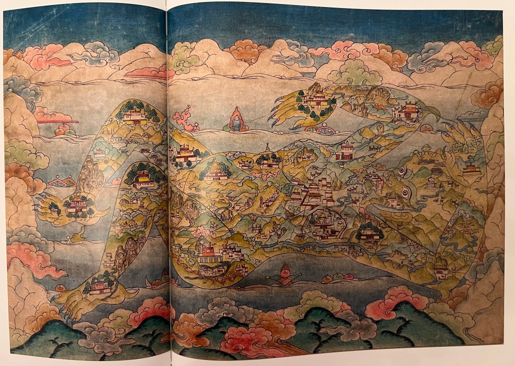 Below is a Map of Tibet, XX century, mineral pigments on cotton, Collection of the Rubin Museum, image via “Tresors du Tibet”by Etienne Rock, Jean-Marc Falcombello, Magali Jenny, Flammarion, Paris, 2022;
