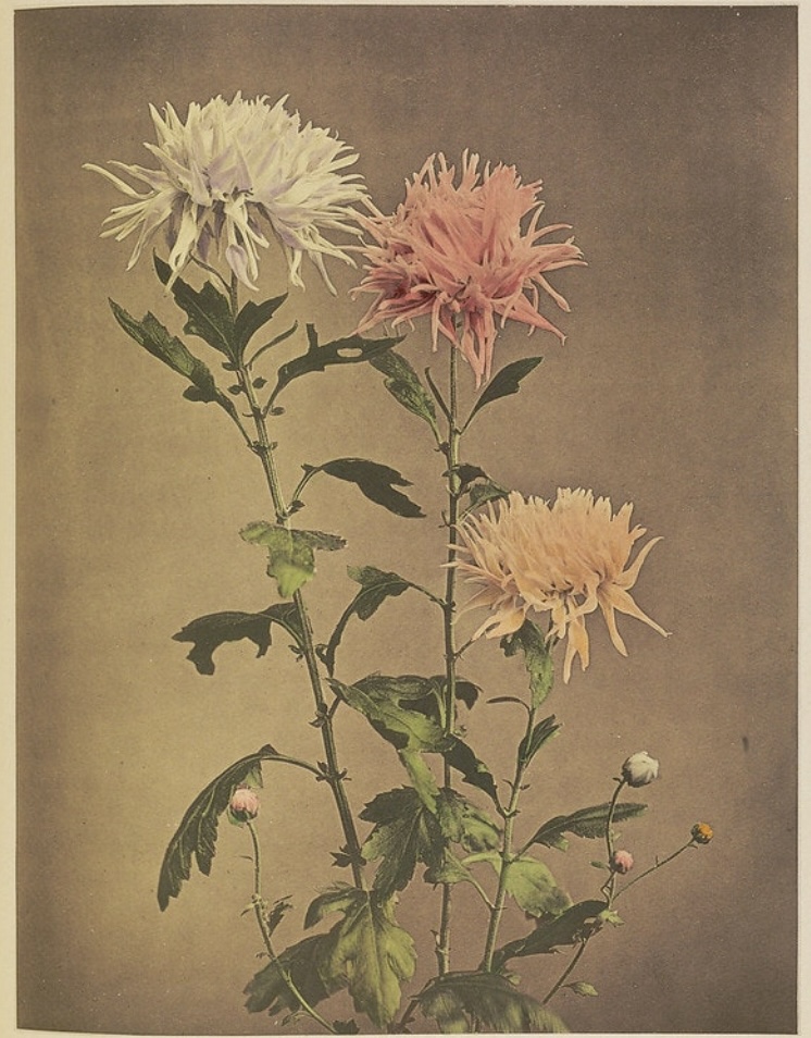 Below are photos of tinted chrysanthemum and peony flowers created by Kazumasa Ogawa (1860-1929), a Japanese photographer, painter and publisher. Images via http://www.publicdomainreview.org; I am attracted with the natural shapes of the flower buds, the petals. Usually, petals are made by Nature in very symmetric order, but these flowers look wild and free, some kind of “undone”. I also like the contrast of greys and pastel hues. I find the background tone in |photographic” colour innovative and unusual.