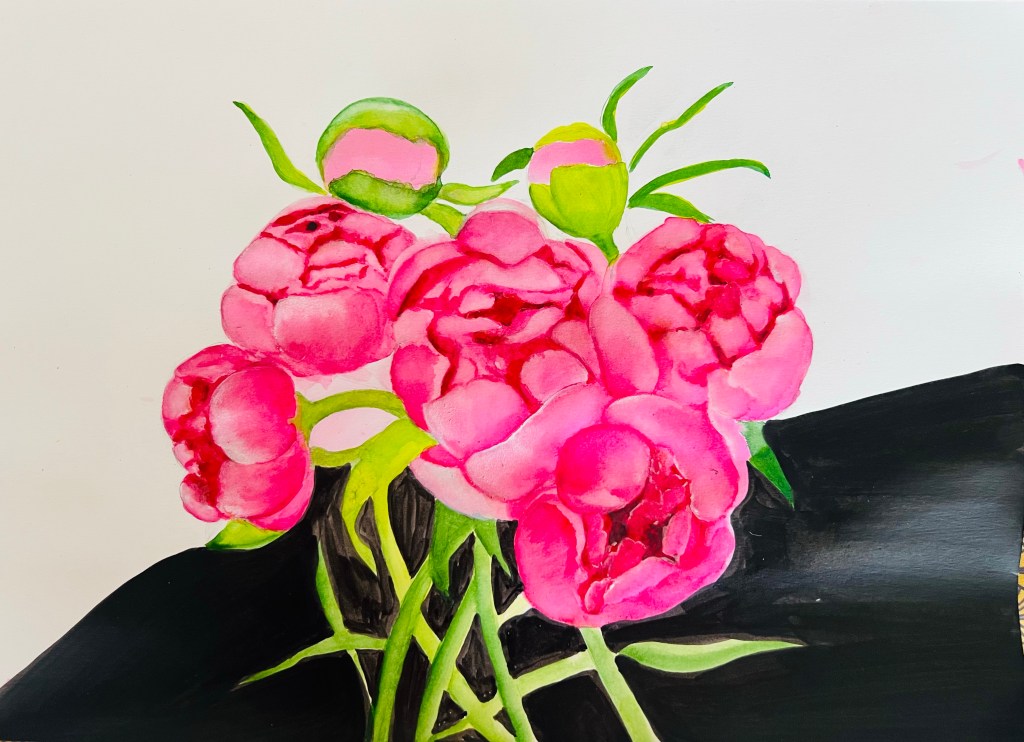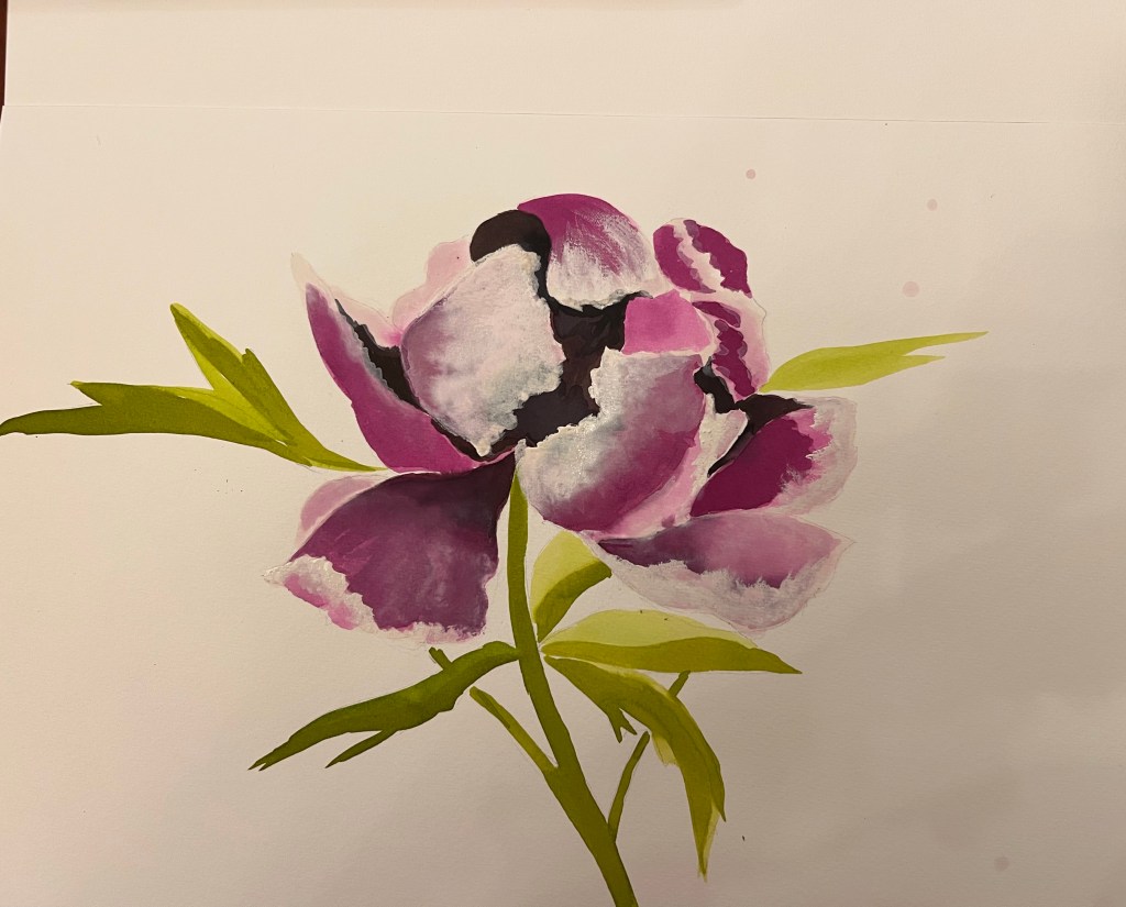 Below is a painting of famous Chinese artist Gal Fenghan (1683-1749). This painting was made by his left hand, since the right one was not functional after his many years in prison. I admire the limited colour palette and the brushstrokes. I picked up this painting as a reference material, because it doesn’t represent classical peony, which often looks too groomed and sweet to me. Here I see a different peony, which I can describe as rebellious and unruly, while they usually are symbols of peace and good, calm, happy life.